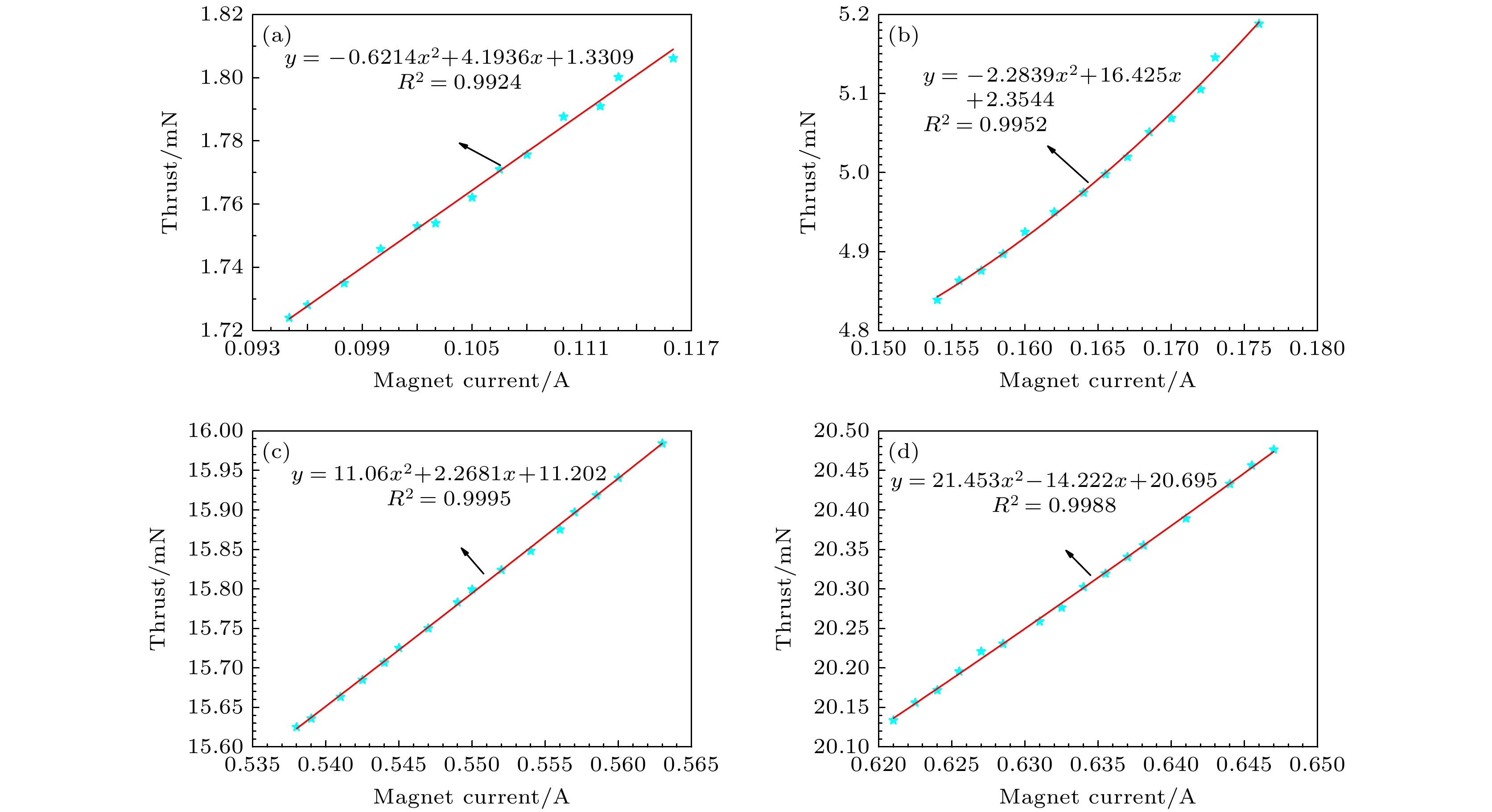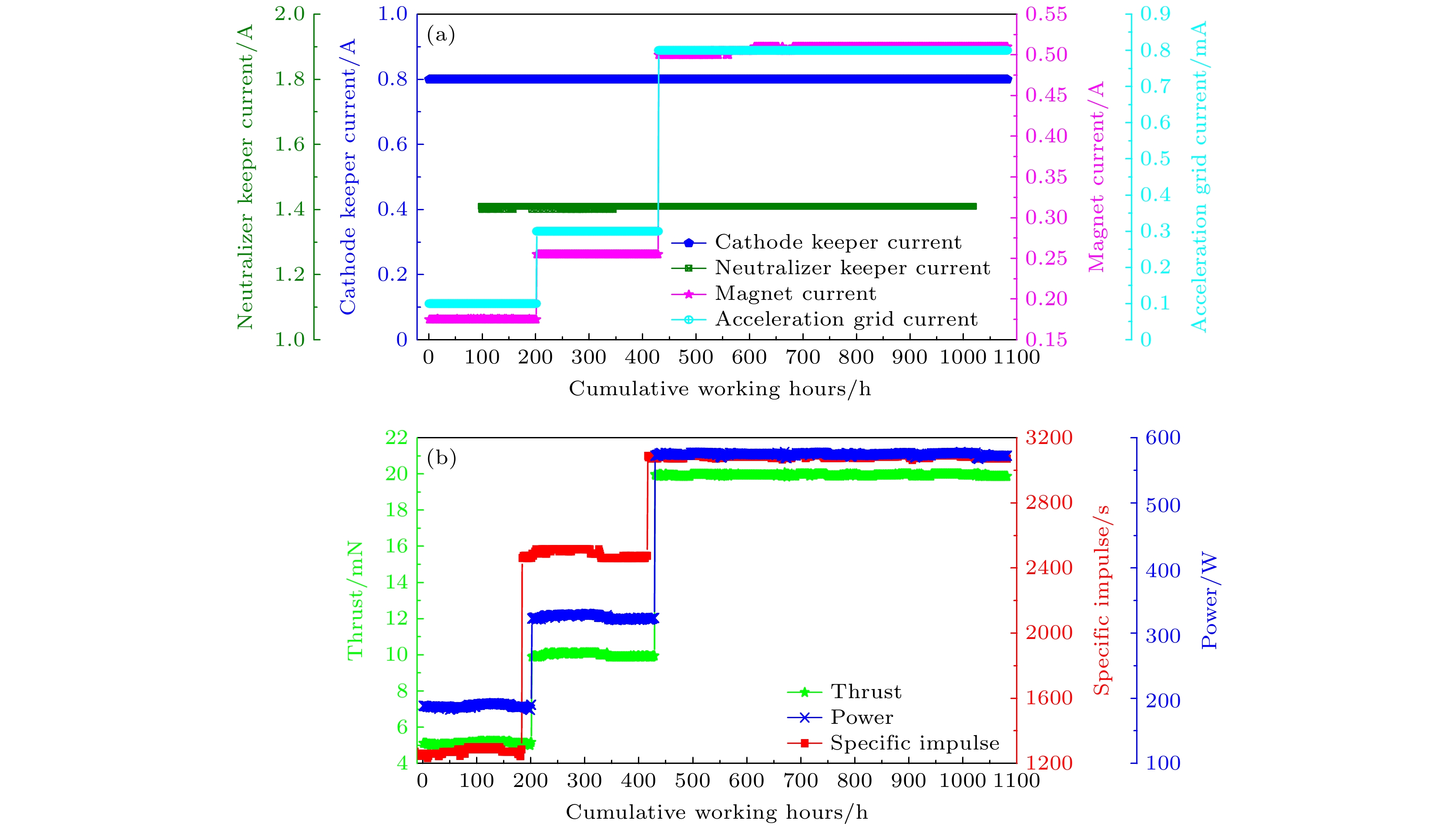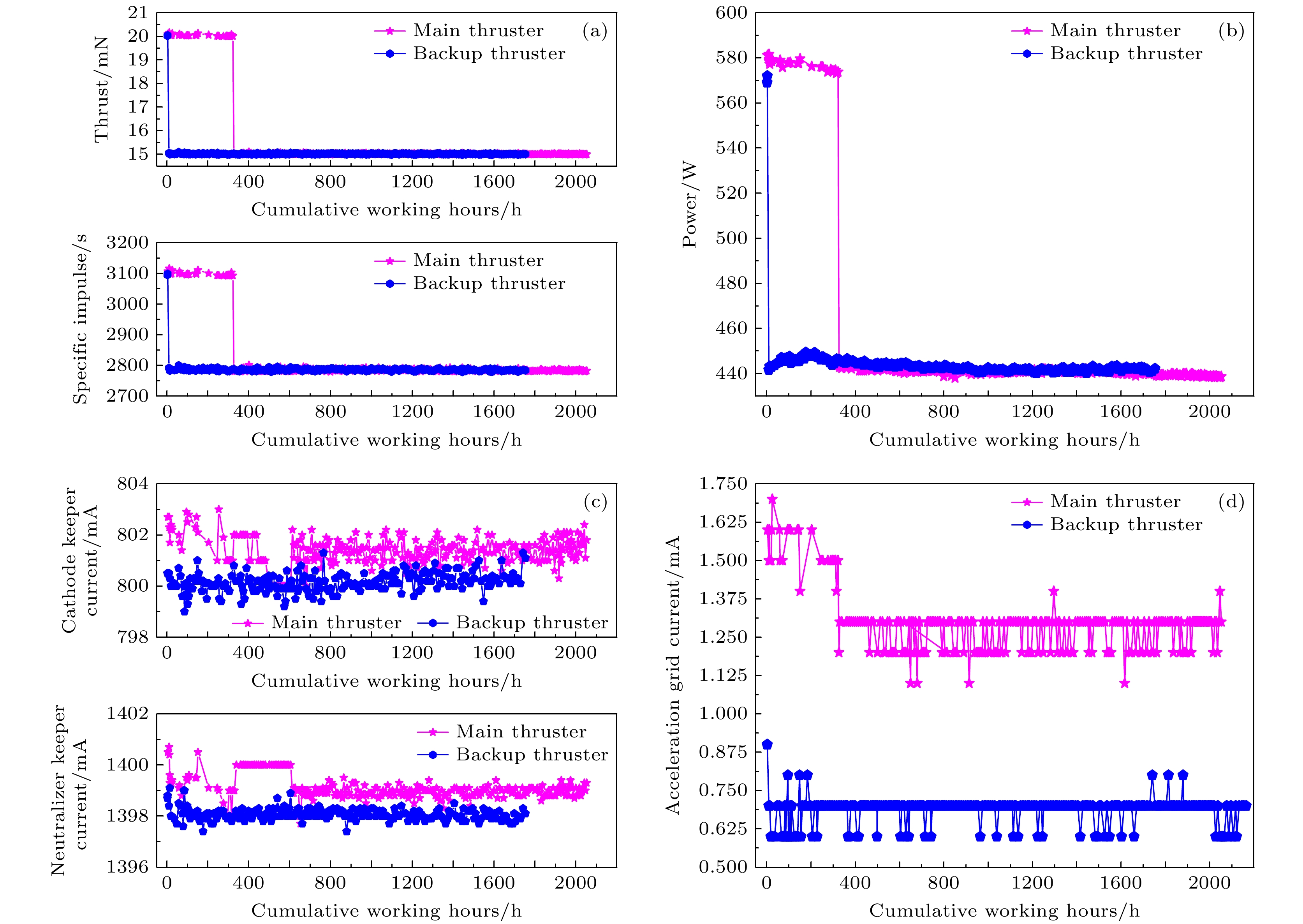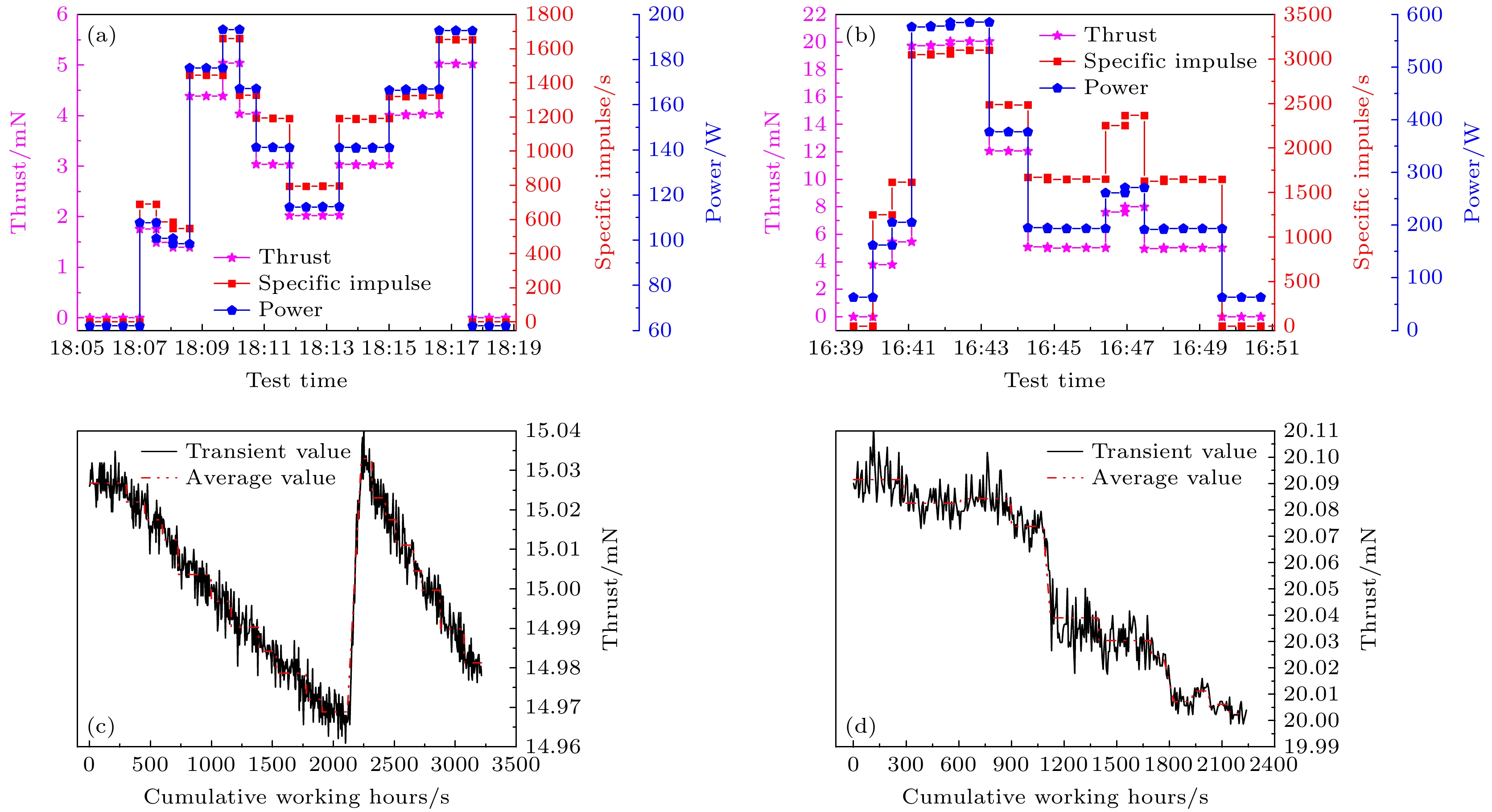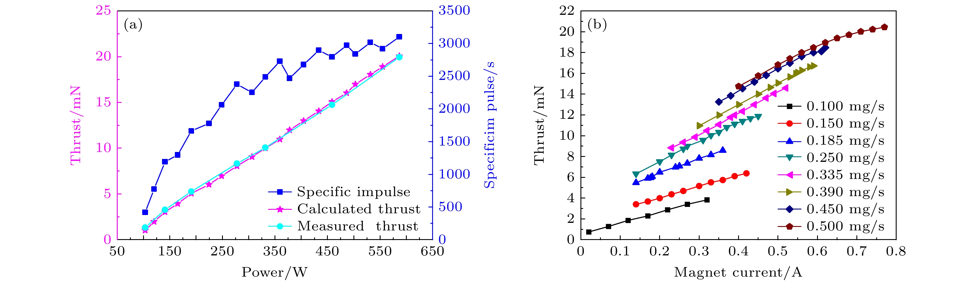 To meet the application requirements for continuous variable thrust capability and high-resolution characteristics for ion thrusters in drag-free flight missions of gravity gradient measurement satellites and precise orbit maintenance missions of near-Earth high-resolution observation satellites, the technical research on a high-resolution wide-range variable thrust ion thruster and its application verification are conducted. Leveraging the weak coupling and relative independence between the two critical physical processes of plasma discharge and ion beam extraction in Kaufman-type ion thrusters, a wide-range variable thrust ion thruster technical scheme with a divergent magnetic field configuration is proposed. The key technical investigations include wide-range discharge stability in the discharge chamber, a concave spherical ion optical system configuration design balancing wide-temperature-range ignition and high-density extraction requirements, and hollow cathode current emission continuity design. The discharge chamber structure based on a divergent magnetic field configuration can rapidly adjust plasma density under varying discharge intensities through optimal coordination of anode gas supply, magnetic induction intensity, and anode current, while resolving critical technical challenges in low-power discharge stability and high-power operational reliability. Adopting a concave spherical ion optical system, the technical challenge in matching grid thermal deformation spacing with the reliable extraction of high-density ion beams is addressed. The concave spherical configuration can realize full-power ion beam extraction within approximately 10 s in low-temperature environments. Meanwhile, the hollow cathode based on a lanthanum hexaboride (LaB6) emitter, through redundant design of emitter thickness and adaptive design of the cathode orifice aspect ratio, not only extends the emitter evaporation loss lifespan but also achieves stable operation within an emission current range of 0.5–3.4 A. Based on this, the design optimization and ground-based performance evaluation of a 10-cm-aperture high-resolution wide-range continuously variable thrust ion thruster are completed (In fact, such an ion thruster already achieved on-orbit flight in 2023.). Satellite on-orbit test results indicate that the 10-cm-aperture thruster achieves thrust regulation of 1.39–20.05 mN within a power range of 98.3–585.3 W, with specific impulse maintained at 547–3056 s, consistent with ground test results. The thrust response rate reaches approximately 3 mN/s, and thrust resolution exceeds 15 μN, outperforming ground test metrics. Compared with traditional chemical propulsion systems used for satellite orbit control, this thruster improves orbit maintenance accuracy by two orders of magnitude, effectively ensuring the implementation of satellite’s on-orbit engineering missions.