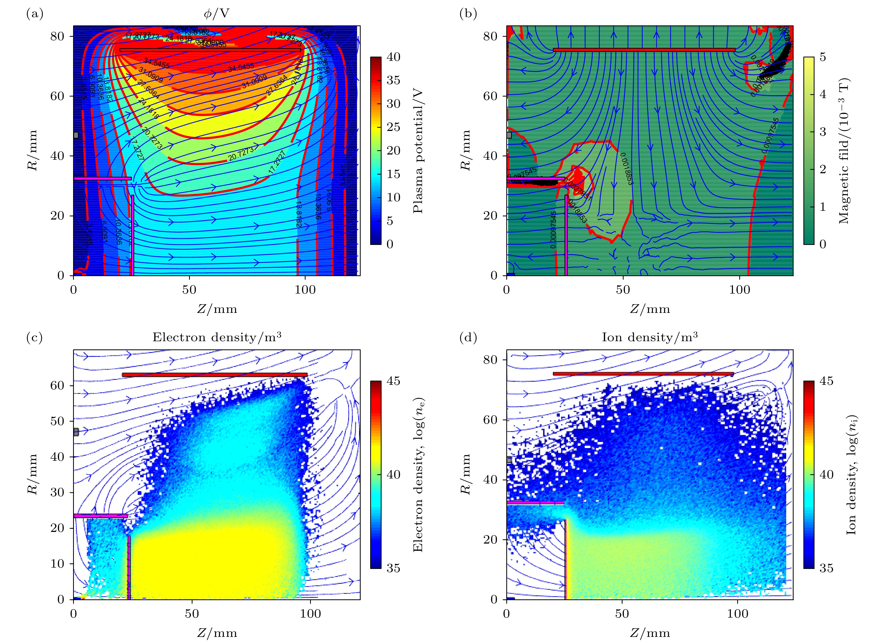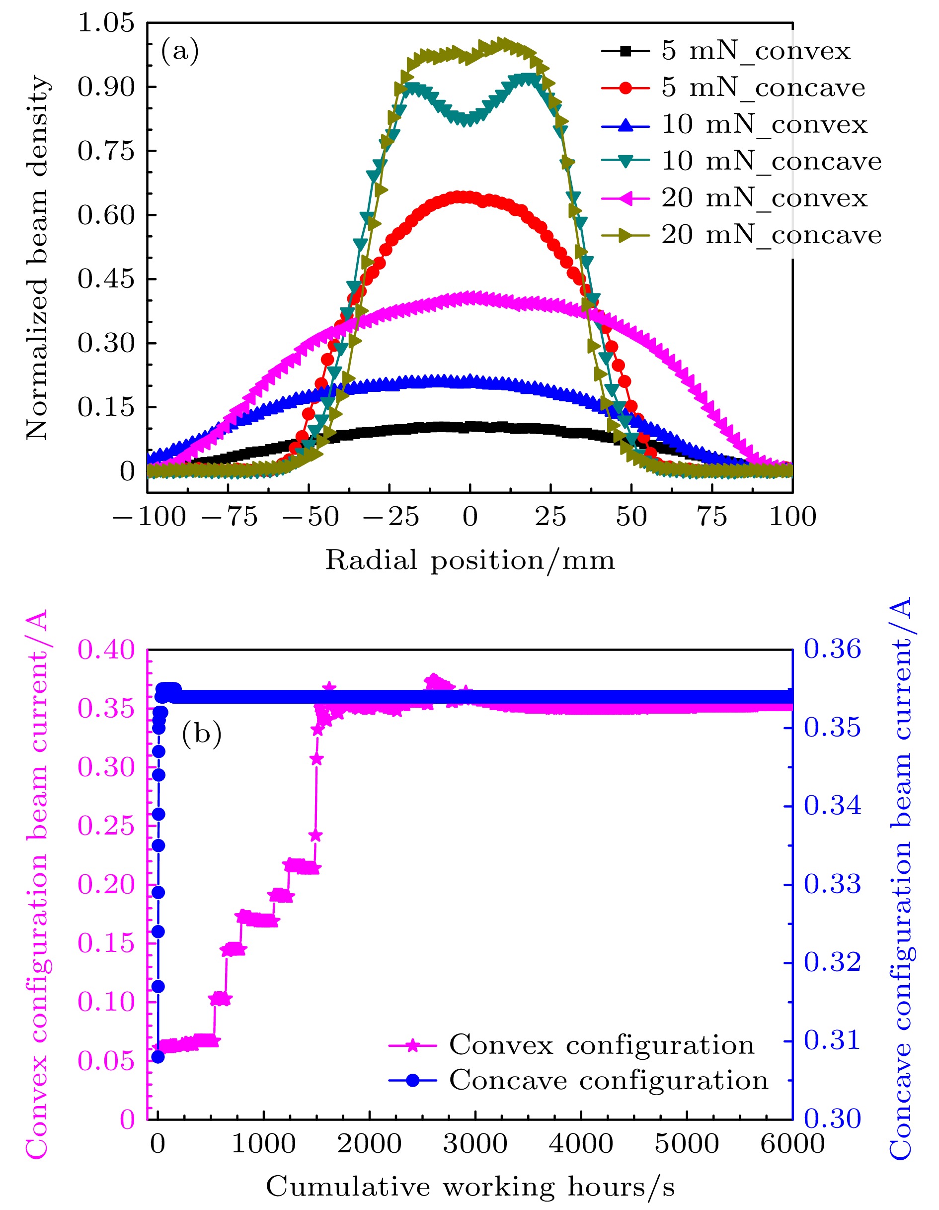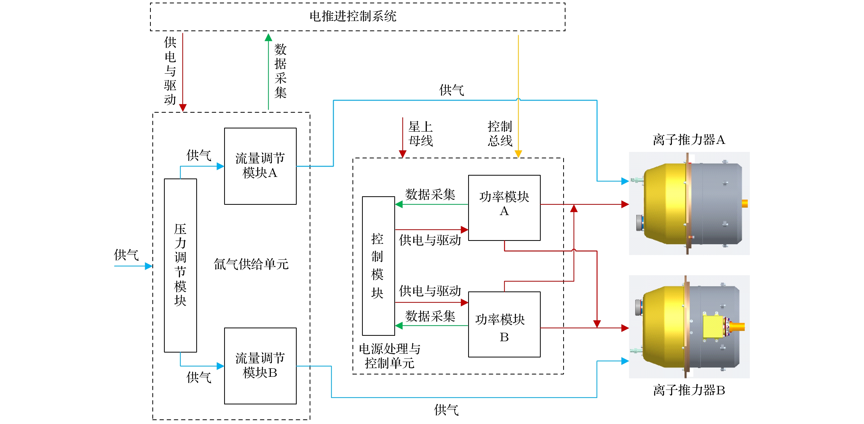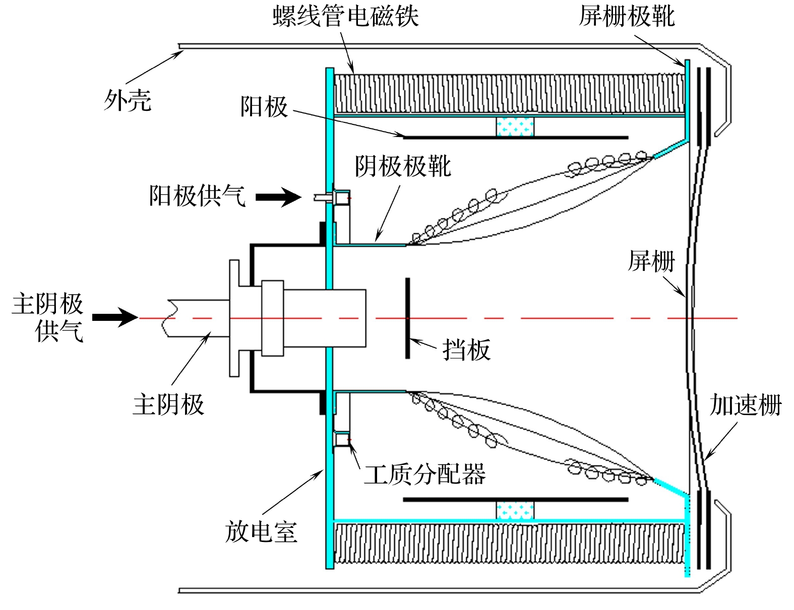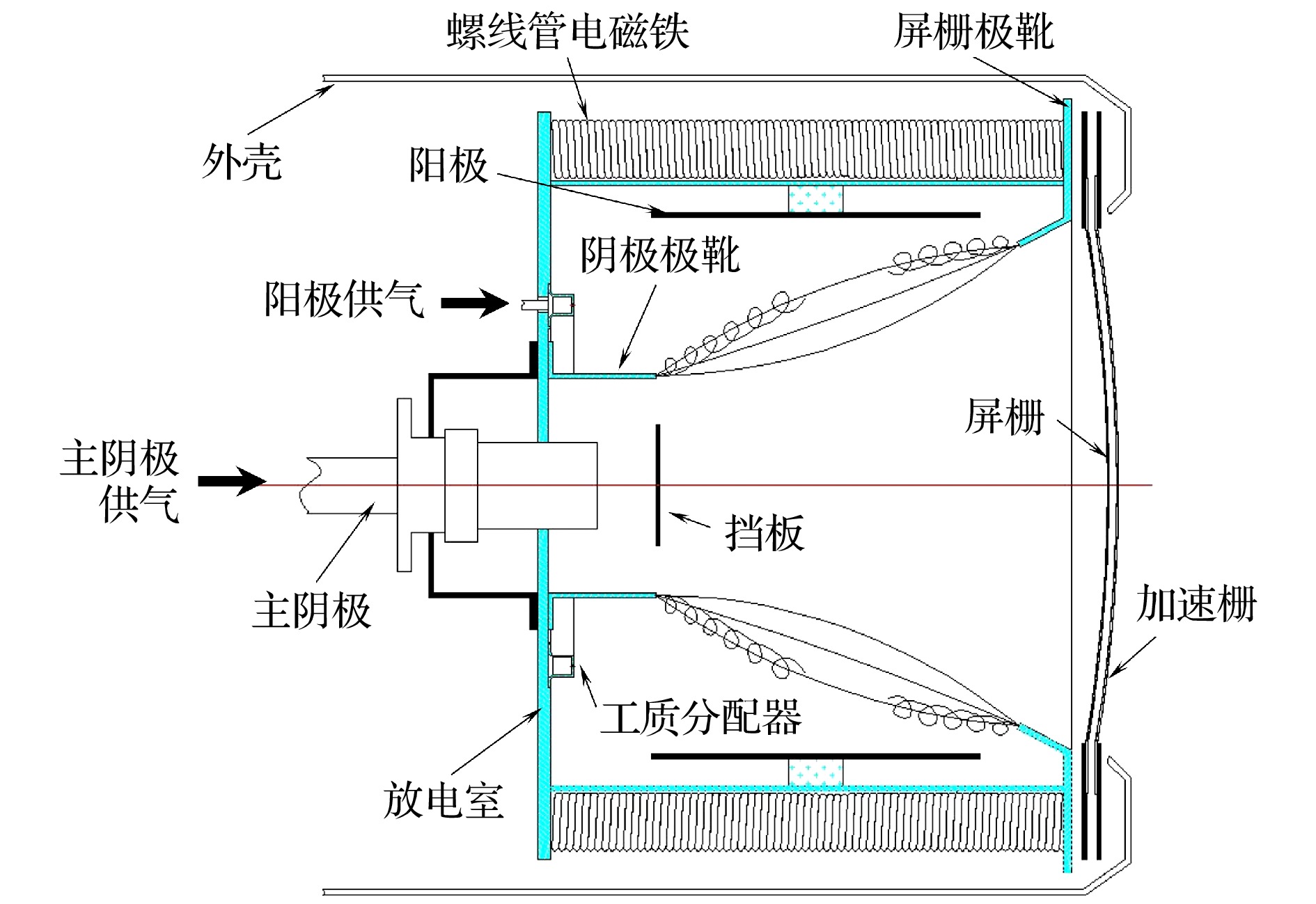 To meet the application requirements for continuous variable thrust capability and high-resolution characteristics for ion thrusters in drag-free flight missions of gravity gradient measurement satellites and precise orbit maintenance missions of near-Earth high-resolution observation satellites, the technical research on a high-resolution wide-range variable thrust ion thruster and its application verification are conducted. Leveraging the weak coupling and relative independence between the two critical physical processes of plasma discharge and ion beam extraction in Kaufman-type ion thrusters, a wide-range variable thrust ion thruster technical scheme with a divergent magnetic field configuration is proposed. The key technical investigations include wide-range discharge stability in the discharge chamber, a concave spherical ion optical system configuration design balancing wide-temperature-range ignition and high-density extraction requirements, and hollow cathode current emission continuity design. The discharge chamber structure based on a divergent magnetic field configuration can rapidly adjust plasma density under varying discharge intensities through optimal coordination of anode gas supply, magnetic induction intensity, and anode current, while resolving critical technical challenges in low-power discharge stability and high-power operational reliability. Adopting a concave spherical ion optical system, the technical challenge in matching grid thermal deformation spacing with the reliable extraction of high-density ion beams is addressed. The concave spherical configuration can realize full-power ion beam extraction within approximately 10 s in low-temperature environments. Meanwhile, the hollow cathode based on a lanthanum hexaboride (LaB6) emitter, through redundant design of emitter thickness and adaptive design of the cathode orifice aspect ratio, not only extends the emitter evaporation loss lifespan but also achieves stable operation within an emission current range of 0.5–3.4 A. Based on this, the design optimization and ground-based performance evaluation of a 10-cm-aperture high-resolution wide-range continuously variable thrust ion thruster are completed (In fact, such an ion thruster already achieved on-orbit flight in 2023.). Satellite on-orbit test results indicate that the 10-cm-aperture thruster achieves thrust regulation of 1.39–20.05 mN within a power range of 98.3–585.3 W, with specific impulse maintained at 547–3056 s, consistent with ground test results. The thrust response rate reaches approximately 3 mN/s, and thrust resolution exceeds 15 μN, outperforming ground test metrics. Compared with traditional chemical propulsion systems used for satellite orbit control, this thruster improves orbit maintenance accuracy by two orders of magnitude, effectively ensuring the implementation of satellite’s on-orbit engineering missions.