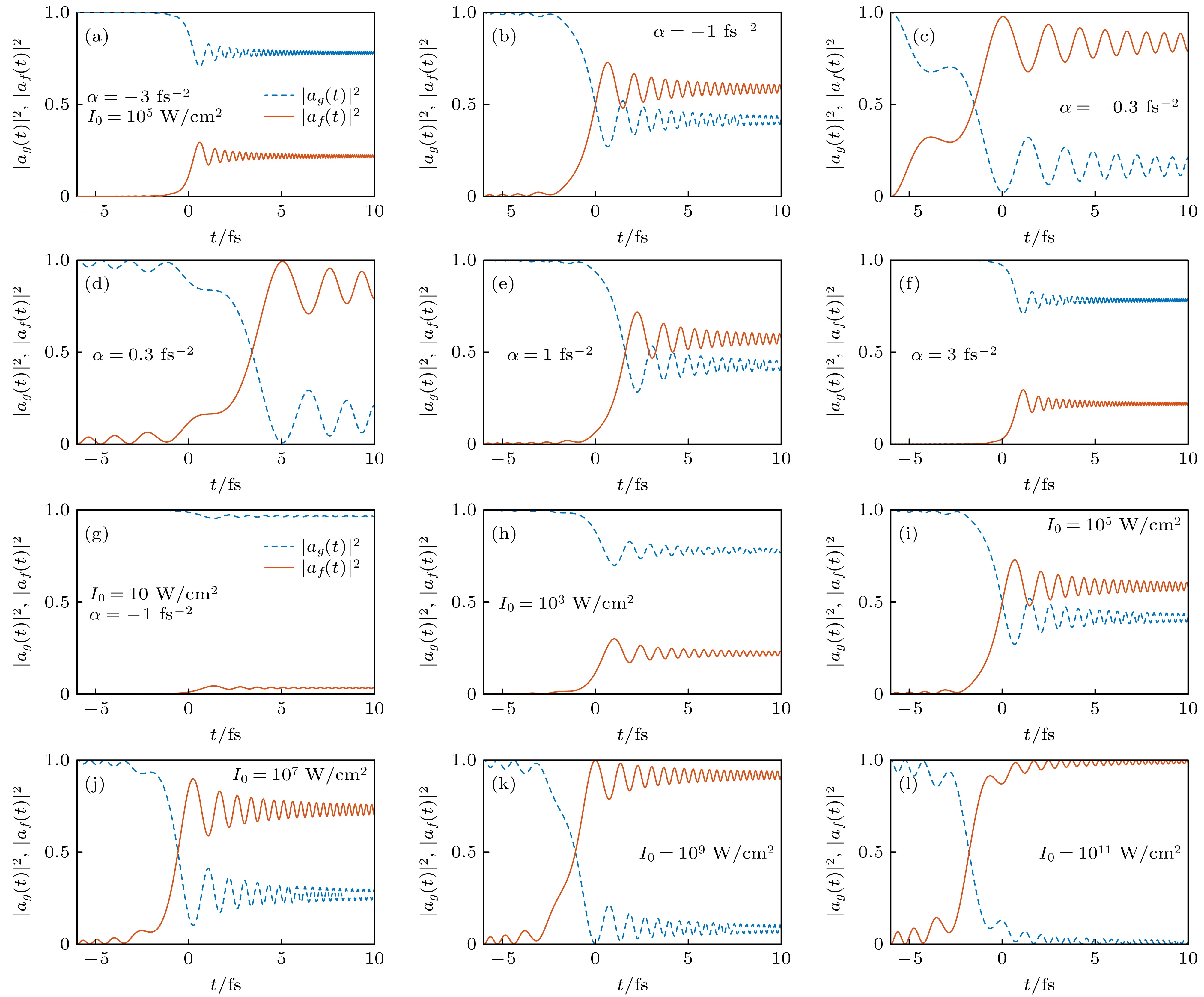In general cases of strong field excitation, the Stark effect has a significant influence on transient two-photon transitions, and the analytic description of this process is quite challenging. By combining analytical solutions and numerical simulations, the transient two-photon transition processes excited by weak and strong chirped pulses are systematically investigated, showing the important influences of parameters such as light field intensity, chirp factor, and detuning on the time-domain evolution of two-photon transition probabilities. Firstly, an approximate analytical expression is derived for the amplitude of the time-domain two-photon transition probability by using the second-order perturbation theory. This analytical solution indicates that the transient two-photon transition process under weak field excitation is similar to the Fresnel rectangular edge diffraction effect. As the light field intensity increases, the influence of the Stark effect on two-photon transitions also intensifies. Secondly, through a series of approximations, the approximate analytical solutions of the Schrödinger equation under strong field interactions are obtained. The analytical solutions show that the strong field Stark effect induces energy level to split, which disrupts the symmetry of the time-domain two-photon transition probability distribution, and its frequency domain process is similar to the “double-slit interference” effect. The research results indicate that the efficiency of population transfer during strong field excitation is closely related to the light field intensity, while the chirp factor can not only regulate the efficiency and time position of population transfer but also change the oscillation frequency of the population probability in the time domain. This work offers new insights into describing the time-domain evolution of the population probability under strong field excitation and lays a scientific basis for research on two-photon microscopy imaging.