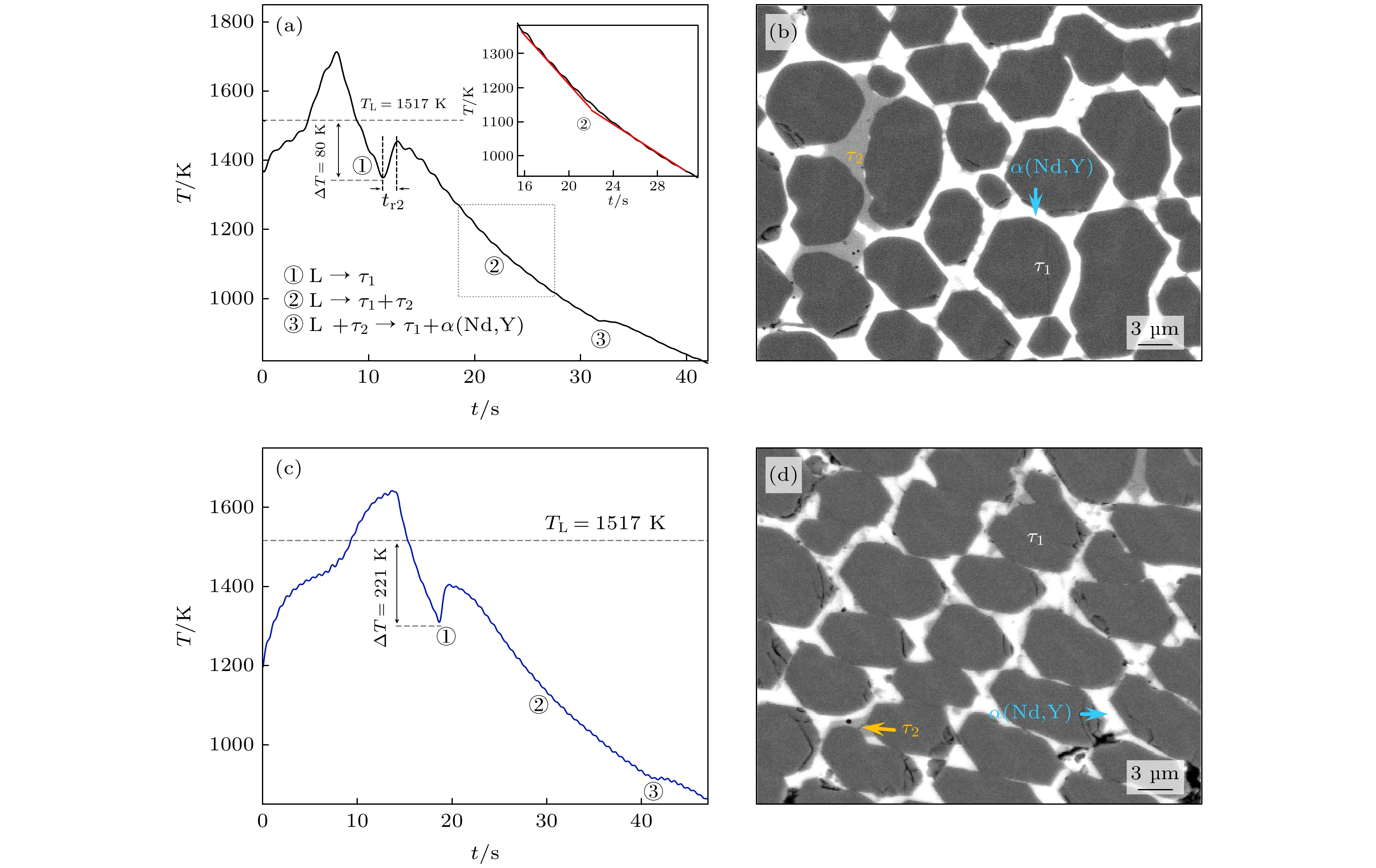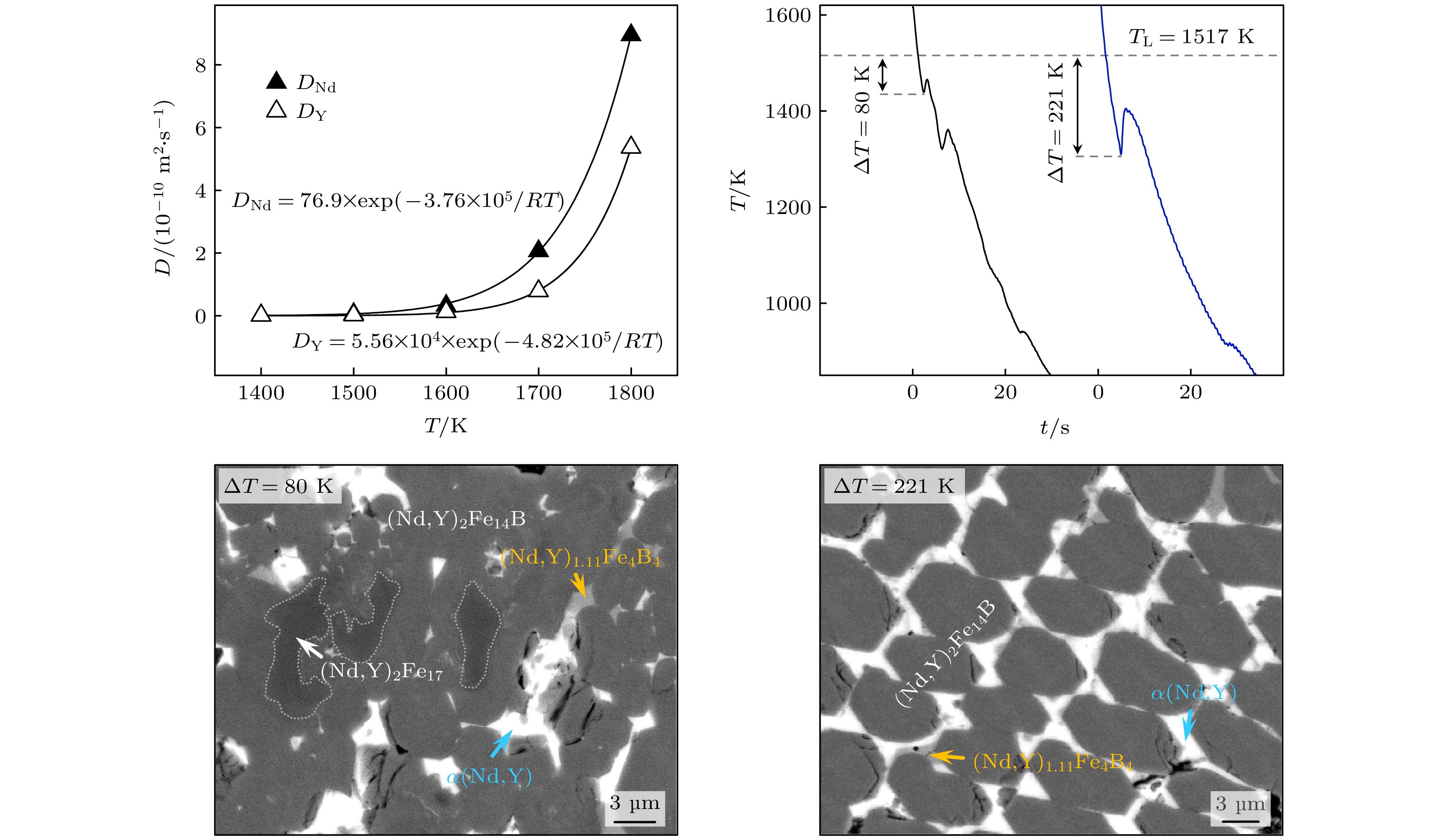 The metastable and stable liquid state thermophysical properties and rapid solidification mechanism of quaternary Fe75.6Nd10Y9B5.4 alloy with a maximum undercooling temperature of 221 K (0.14TL) are investigated using electrostatic levitation technique. The measured results indicate that the density, thermal expansion coefficient and the ratio of specific heat to emissivity of the liquid alloy comply with linear functional relationship with temperature in the range of 1402–1618 K. Molecular dynamics (MD) simulations show that the diffusion coefficients of Nd and Y elements decrease exponentially with temperature decreasing, with the former exhibiting a larger diffusion coefficient at the same temperature. When the liquid undercooling rises from 80 to 158 K, the growth velocity of primary (Nd,Y)2Fe17 phase dendrites increases from 3.8 to 5.7 mm·s–1, while exhibiting significant grain refinement effect. Meanwhile, the increased undercooling also promotes peritectic transformation, leading the volume fraction of peritectic τ1-(Nd,Y)2Fe14B phase to reach up to 75%. Once the undercooling reaches 180 K, the former peritectic τ1 phase, rather than the primary (Nd,Y)2Fe17 phase, becomes the leading phase, which nucleates and grows directly from the undercooled liquid alloy, and its growth velocity increases with undercooling from 2.6 to 11.0 mm·s–1. The calculation results of formation enthalpy show that the solid solution of the Y element can enhance the thermodynamic stability of the (Nd,Y)2Fe17 phase and the τ1 phase, thereby explaining the reason why the content of Y element in both phases is significantly higher than that of Nd element. Nevertheless, the content of Nd element in the τ1 phase slightly increases because its diffusion ability is stronger than that of Y if undercooling is higher than 180 K.