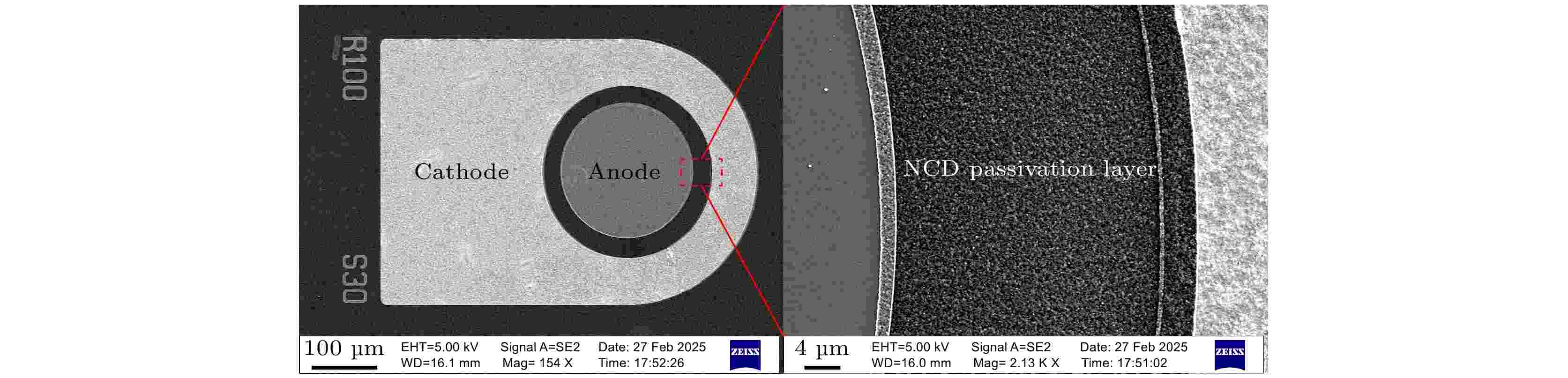 Thermal accumulation under high output power density is one of the key bottlenecks faced by GaN-based power devices. The nanocrystalline diamond (NCD) passivation layer strategy plays a crucial role in improving heat dissipation in high-power GaN devices, while the existing studies focus on GaN-based HEMT. In this study, nanocrystalline diamond films with a thickness of 380–450 nm are grown on Si-based AlGaN/GaN heterostructure materials using a microwave plasma chemical vapor deposition (MPCVD) system. Consequently, lateral Schottky barrier diode devices with NCD passivation are fabricated, and their electrical and thermal properties are investigated. The results show that the DC forward characteristics of the NCD passivated diodes are essentially the same as those of devices without NCD passivation. Moreover, dynamic voltage tests indicate that the NCD passivation layer significantly mitigates current collapse in GaN devices at high frequencies. Under a –20 V DC bias and a pulse voltage of 2.5 V, the current density degradation of NCD passivated devices is only 2.6%, whereas devices without diamond passivation almost completely degrade. Thermal imaging microscopy under varying DC power levels shows that thermal failure occurs at an output power density of approximately 4 W/mm for conventional devices, while NCD passivated devices can reach around 7.5 W/mm. The electrical degradation behaviour of NCD passivated device is also tested under long-time reverse bias. This work demonstrates for the first time the application of nanocrystalline diamond passivation to thermal management of GaN-based power diodes, and clearly demonstrates the potential of this strategy in non-HEMT power device applications.