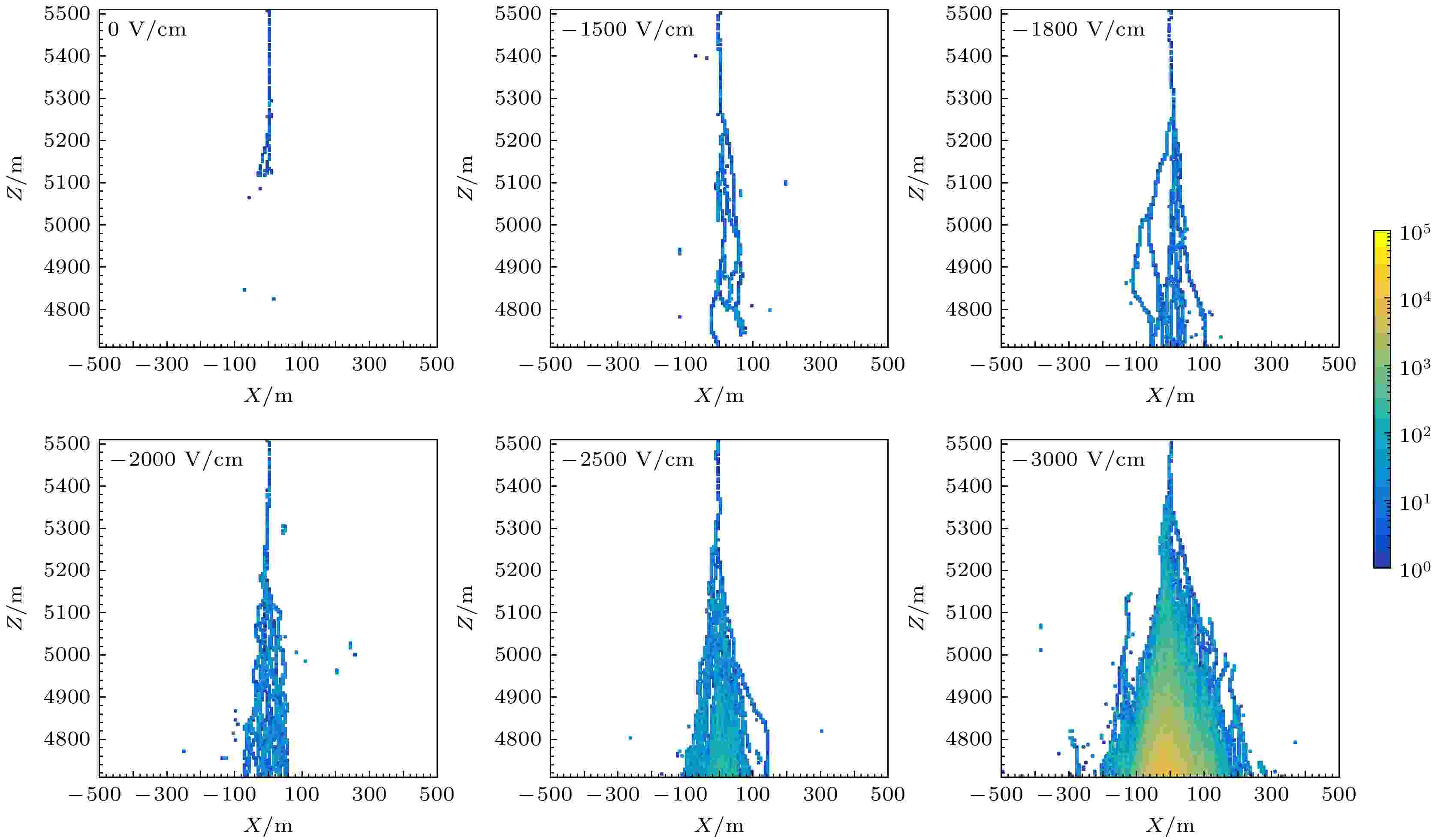 Terrestrial Gamma-ray flashes (TGFs) originating from the Earth’s atmosphere, accompanied by thunderstorms and lightning activity, are one of the hot spots in the interdisciplinary of cosmic ray and atmospheric physics. Over the years, satellite experiments have detected thousands of upward TGFs during thunderstorms, while ground-based experiments have observed some downward TGFs. Nowadays, it is widely believed that TGFs accompanying lightning leaders observed by satellite-based and ground-based experiments involve relativistic runaway electron avalanche (RREA) production. Due to triggering the relativistic runaway electron avalanche (RREA) process needing a very large electric field strength and region, it is difficult to study the RREA process through ground-based experiments. In this paper, CORSIKA 7.7410 software package, combined with a vertically uniform electric field model, is adopted to simulate the intensity and energy distribution of RREA electrons in thundercloud with different electric field strengths induced by seed electrons and the secondary electrons in extensive air shower (EAS) from vertical protons with different primary energies. The results show that the number of RREA electrons increases exponentially with the thickness of the thunderclouds increasing, and also increases exponentially with the electric field strength rising. After passing through the atmosphere with an electric field of –3000 V/cm and a thickness of 800 m, the number of secondary electrons in RREA process increases by approximately 3×104 times. The characteristic length of avalanche (λ) decreases as the electric field strength increases. When the electric field is –1600 V/cm and –3000 V/cm, the λ is approximately ~282 m and ~69 m, respectively. The energy spectrum of RREA electrons gradually softens with the increase of layer thickness and strength of electric field, and their average energy increases with the increase of electric field strength, when the thundercloud thickness exceeds 400 m, the mean energy of RREA electrons gradually stabilizes. When secondary particles pass through a thundercloud with an electric field strength of –3000 V/cm and a thickness of 800 m, the mean energy of RREA electrons is approximately 11.7 MeV. Through the Monte Carlo simulations, the RREA process, which is difficult to observe directly in the atmosphere, is successfully simulated. The simulation results provide important information for studying the characteristics of TGF source regions, offer clues for detecting downward TGF in ground-based experiments, and contribute to the research on the triggering mechanism of lightning in the atmosphere. In addition, our simulation results are expected to elucidate the relationship between TGF and lightning activity, promoting interdisciplinary research in the fields of atmospheric physics and cosmic ray physics.