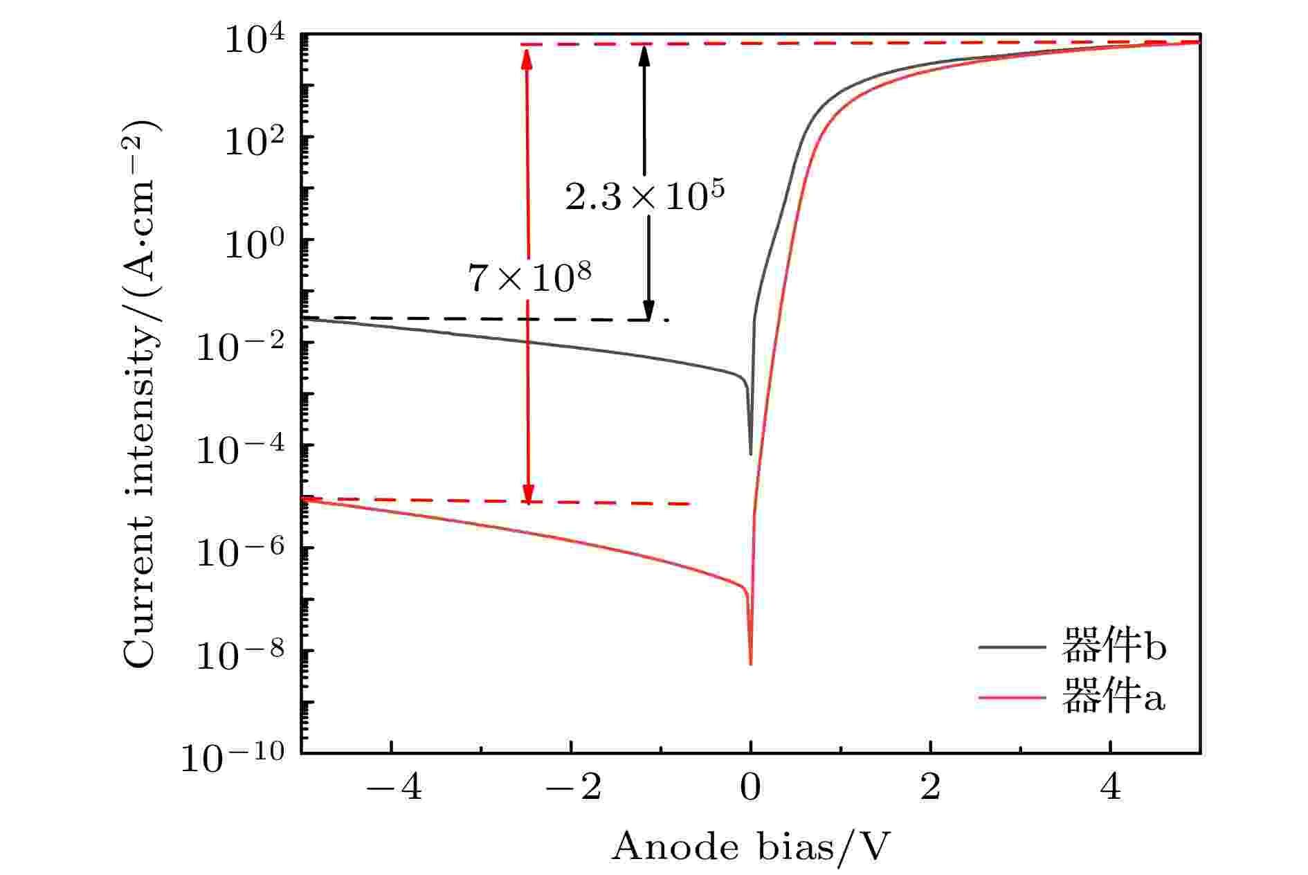 GaN based Schottky barrier diode (SBD) possesses advantages including high power density, high conversion efficiency, and excellent switching characteristics. During heteroepitaxial growth of GaN, a high density of threading dislocations is inevitably introduced, which can degrade device reliability. This paper reports a low dislocation density N+/N– GaN quasi-vertical SBD fabricated on a freestanding GaN substrate. The characterization results of high-resolution X-ray diffraction and atomic force microscopy demonstrate that the high-quality epitaxial layer with a total dislocation density of 1.01 × 108 cm–2 and a root mean square surface roughness of 0.149 nm is achieved on a freestanding GaN substrate. The device prepared based on a high-quality epitaxial layer exhibits an ultra-low leakage current density of 10–5 A/cm2 at a reverse voltage of –5 V, without employing any edge termination structures or field plates or plasma treatment. Compared with the devices prepared on sapphire substrates using identical processes, the device prepared in this work reduces the reverse leakage current by four orders of magnitude. The experimental results show that the quasi-vertical GaN based SBD fabricated on a freestanding GaN substrate significantly reduces reverse leakage current and substantially enhances the overall electrical performance of the device. By employing emission-microscope (EMMI), leakage current in quasi-vertical SBD is identified to be primarily localized at the anode edge, and the underlying leakage mechanism is elucidated. Finally, temperature-dependent measurements demonstrate that the device maintains a leakage current below 10–3 A/cm2 at 100 ℃, confirming the potential of quasi-vertical SBD on freestanding GaN substrate for practical applications.