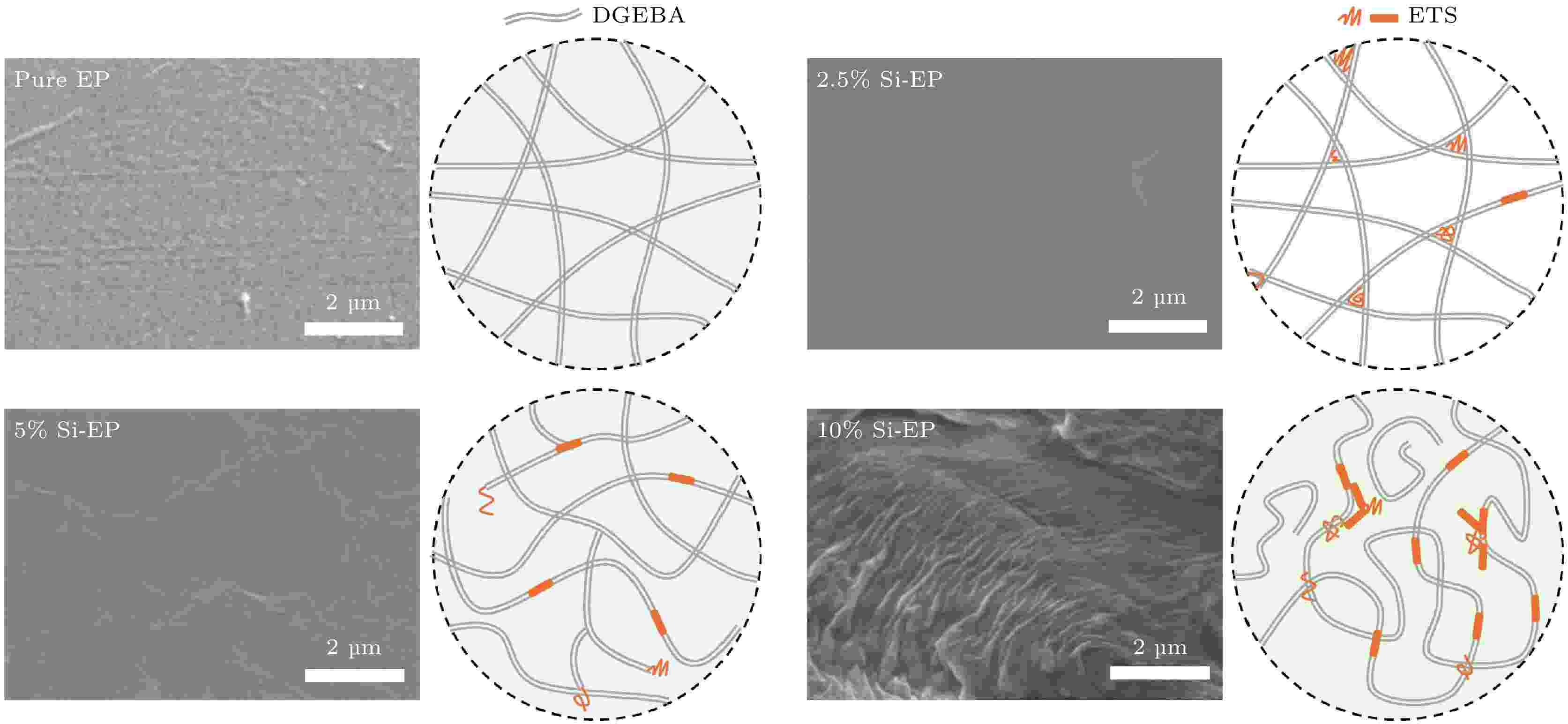 The ongoing trend toward high-power and miniaturized electronic devices has raised increasingly stringent requirements for the high-temperature electrical properties of epoxy encapsulating materials. In this study, epoxy-terminated phenyltrisiloxane (ETS) is used as a functional monomer to incorporate Si-O bonds into bisphenol-A epoxy resin through crosslinking reactions, thereby systematically investigating the influence and modulation effects of ETS on the structure and high-temperature electrical characteristics of epoxy composites. Gel content measurements indicate that as the concentration of ETS increases, the gel content of the epoxy resin composite decreases accordingly, suggesting that higher ETS content reduces the crosslinking density of the epoxy network. Experimental test results demonstrate that compared with pure epoxy resin, the composite with 2.5% ETS exhibits superior performance: the glass transition temperature increases to 129 ℃ with thermal decomposition temperature rising, while showing optimal high-temperature (70 ℃) electrical properties including significantly reduced conductivity, markedly suppressed space charge accumulation, deepened trap energy level (from 0.834 eV to 0.847 eV), reduced dielectric loss (0.005 at 50 Hz), and improved breakdown strength (74.2 kV/mm). Notably, as the ETS content increases, the electrical properties of epoxy composite follow a non-monotonic concentration dependence, initially enhancing then deteriorating, exhibiting evolutionary characteristics similar to those of nanoparticle-modified systems. Herein, a competitive mechanism between the epoxy network structure and intrinsic properties of ETS is proposed to explain this phenomenon: at low concentrations, the original C—C network dominates, where the intrinsic properties of ETS are constrained by the host matrix, leading to improved thermal stability. Simultaneously, the bandgap difference between ETS and DGEBA establishes charge barriers that can enhance insulation performance. However, at higher concentrations, the reduced crosslinking density and increased free volume caused by reactivity and structural mismatch between ETS and DGEBA ultimately lead to performance degradation. This study offers crucial theoretical insights into and produces the design strategies for developing high-performance siloxane-modified epoxy encapsulants.