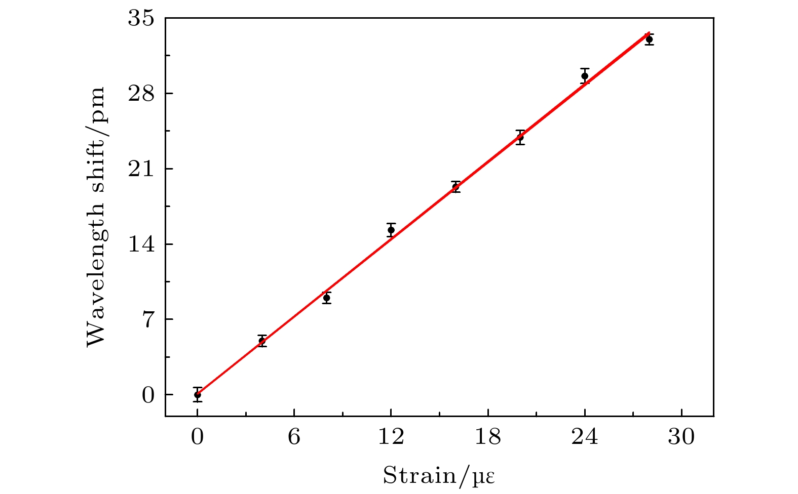 The fiber Bragg grating has the characteristics of anti-electromagnetic interference, electrically passive operation, multi-point sensing, corrosion resistance, and compact size. An ultra-narrow linewidth transmission peak can be formed by introducing a π phase shift at the center of uniform fiber Bragg grating. But this π phase-shifted fiber Bragg grating (PSFBG) with an ultra-narrow linewidth is very sensitive to the input optical intensity. The photothermal effect generated by the input light inside the grating will cause the frequency shift, which will degrade the measurement precision of grating. At the same time, the frequency drift of the laser itself will also increase the measurement error. In this paper, a high-precision strain measurement method is proposed by using the PSFBG with an ultra-narrow linewidth based on the frequency-stabilized laser. The incident laser is attenuated to a single-photon level to eliminate the photothermal effect in the PSFBG. The laser frequency is stabilized to the PSFBG with an ultra-narrow linewidth of 38 MHz by using the single-photon modulation technology. The influence of low-frequency flicker noise is eliminated through 9-kHz high-frequency modulation. The filter bandwidth of lock-in amplifier is 312.5 Hz with the integration time and filter slope of 300 μs and 18 dB, respectively. The signal-to-noise ratio of error signal from the lock-in amplifier is 34. By tuning the resonant cavity length of the laser with the error signal, the output laser frequency is stabilized to the Bragg frequency of the PSFBG with an ultra-narrow linewidth of 38 MHz. The laser frequency fluctuation is limited to 4 MHz within 1000 s. The response sensitivity of Bragg wavelength to external strain in a range of 0 to 30 με is 1.2 pm/με, with a standard error of 0.023 pm/με, and the linear fitting correlation coefficient is R2 = 0.997. Due to the random drift of Bragg wavelength, caused by the environment temperature fluctuations, the corresponding strain measurement precision is 0.05 με. The high-precision strain measurement by using the PSFBG with an ultra-narrow linewidth based on the frequency-stabilized laser is achieved, which will play an important role in the field of aerospace, civil engineering, energy engineering, etc.