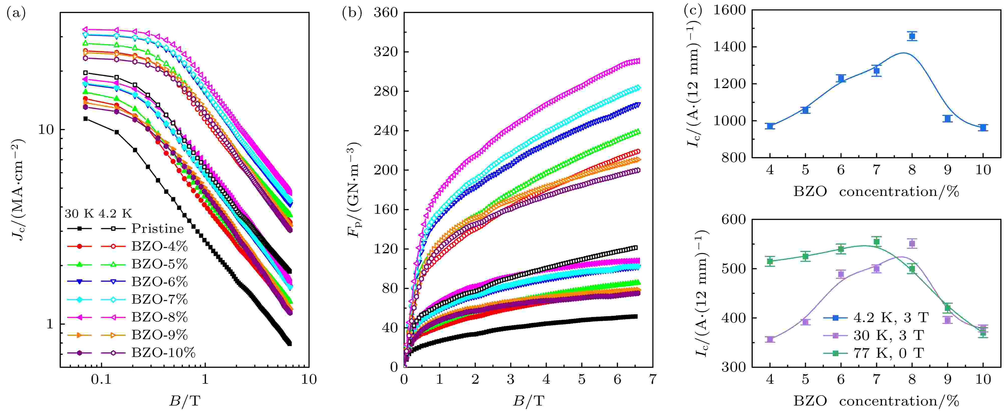 Introducing nano heterogeneous phases into YBa2Cu3O7–δ (YBCO) superconducting films is a common way to improve its flux pinning properties and in-field performances. The heterogeneous phases generated through traditional element doping strategies is highly sensitive to the sintering conditions, making the growth of the nano inclusions difficult to control under high-temperature environments. Unintended large-scale growth and aggregation of the doped phases can significantly reduce the efficiency of flux pinning of YBCO superconducting films, thereby limiting the overall enhancement of pinning performance in superconducting thin films. This occurs because the size of the vortex core (≈2ξ) cannot be effectively matched with excessively large defects. To address this challenge, the incorporation of monodisperse, small-sized prefabricated nanocrystals into YBCO superconducting coated conductors fabricated by the metal organic deposition (MOD) method offers an effective solution. This method can significantly improve the uniformity of heterogeneous phase size and spatial distribution, enabling the formation of dispersed and size-controllable artificial flux pinning centers. Such a strategy represents one of the most promising methods of enhancing magnetic flux pinning and increasing the critical current density under applied magnetic fields through MOD route. In this study, the prefabricated nanocrystals addition technology is adopted to introduce the mono-dispersed small-sized BaZrO3 (BZO) nanocrystals as flux pinning centers in YBCO high-temperature superconducting tapes, resulting in the significant enhancement of the in-field performance of YBCO films at low temperatures. This study systematically examines the effects of adding BZO nanocrystals with an initial size of approximately 8 nm at various mol concentrations from 4% to 10%. The results indicate that the optimal mole concentration for improving both self-field and field properties of YBCO is 8% BZO under temperature conditions of 4.2, 30, and 77 K. At 30 K and 3 T, the Fp value for the sample with a mole concentration of 8% BZO is approximately 92.06 GN/m3, which is 1.54 times higher than that of the mole concentration of 4% BZO sample and 2.3 times higher than that of the original sample.