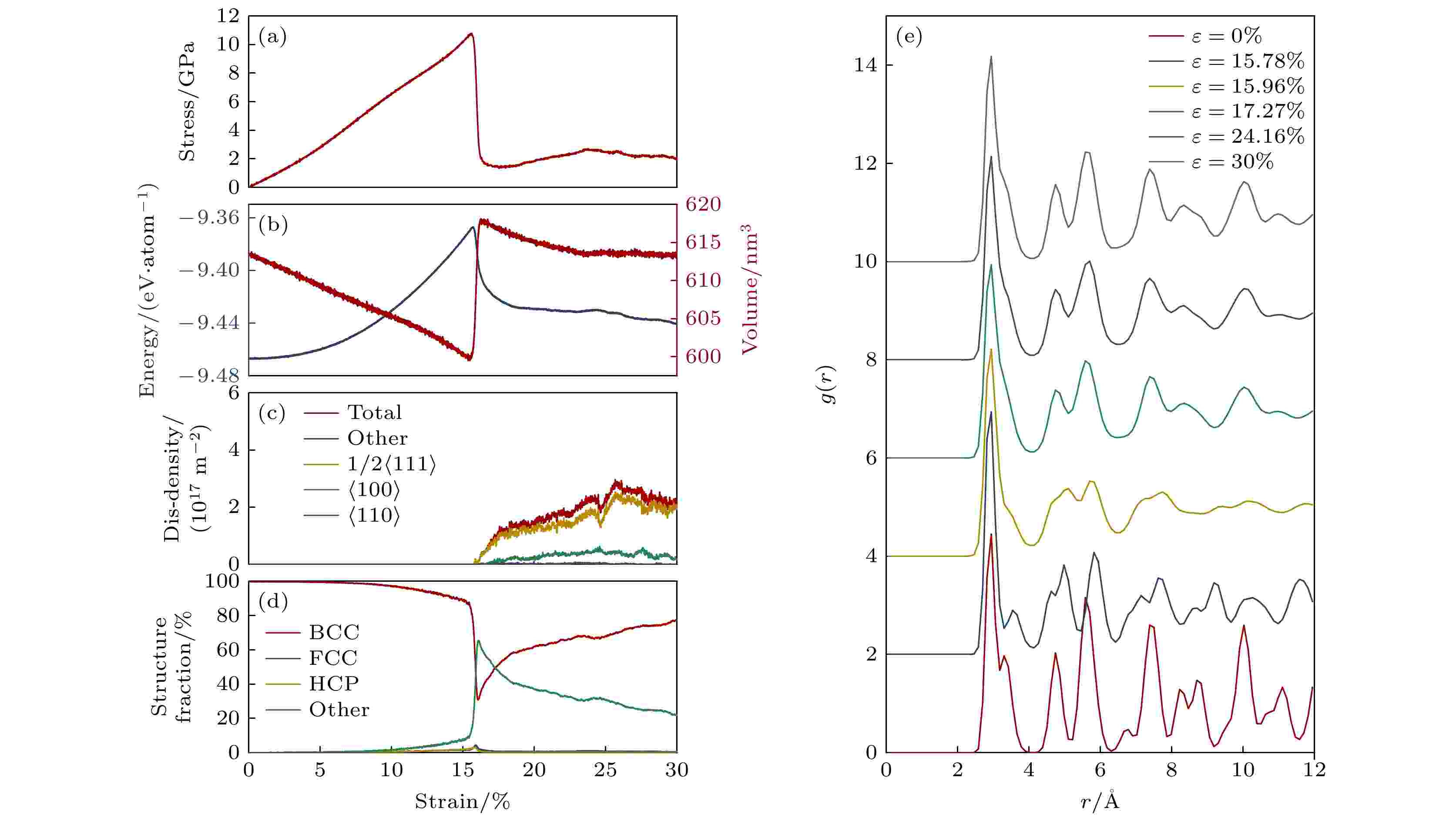 Refractory multi-principal element alloys (RMPEAs)have become a hotspot in materials science research in recent years due to their excellent high-temperature mechanical properties and broad application prospects. However, the unique deformation mechanisms and mechanical behaviors of the NbTaTiZr quaternary RMPEA under extreme conditions such as high temperature and high strain rate are still unclear, limiting its further design and engineering applications. In order to reveal in depth the dynamic response of this alloy on an atomic scale, this study develops a high-accuracy machine learning potential (MLP) for the NbTaTiZr quaternary alloy and combines it with large-scale molecular dynamics (MD) simulations to systematically investigate the effects of crystallographic orientation, strain rate, temperature, and chemical composition on the mechanical properties and microstructural evolution mechanisms of the alloy under compressive loading. The results show that the NbTaTiZr alloy exhibits significant mechanical and structural anisotropy during uniaxial compression. The alloy exhibits the highest yield strength when loaded along the [111] crystallographic direction, while it shows the lowest yield strength when compressed along the [110] direction, where twinning is more likely to occur. Under compression along the [100] direction, the primary deformation mechanisms include local disordering transitions and dislocation slip, with 1/2$ \left\langle{111}\right\rangle $ dislocations being the dominant type. When the strain rate increases to 1010 s–1, the yield strength of the alloy is significantly enhanced, accompanied by a notable increase in the proportion of amorphous or disordered structures, indicating that high strain rate loading suppresses dislocation nucleation and motion while promoting disordering transitions. Simulations at varying temperatures indicate that the alloy maintains a high strength level even at temperatures as high as 2100 K. Compositional analysis further indicates that increasing the atomic percentage of Nb or Ta effectively enhances the yield strength of the alloy, whereas an increase in Ti or Zr content adversely affects the strength. By combining MLP with MD methods, this study elucidates the anisotropic characteristics of the mechanical behavior and the strain rate dependence of disordering transitions in the NbTaTiZr RMPEA under combination of high strain rate and high temperature, providing an important theoretical basis and simulation foundation for optimizing and designing novel material under extreme environments.