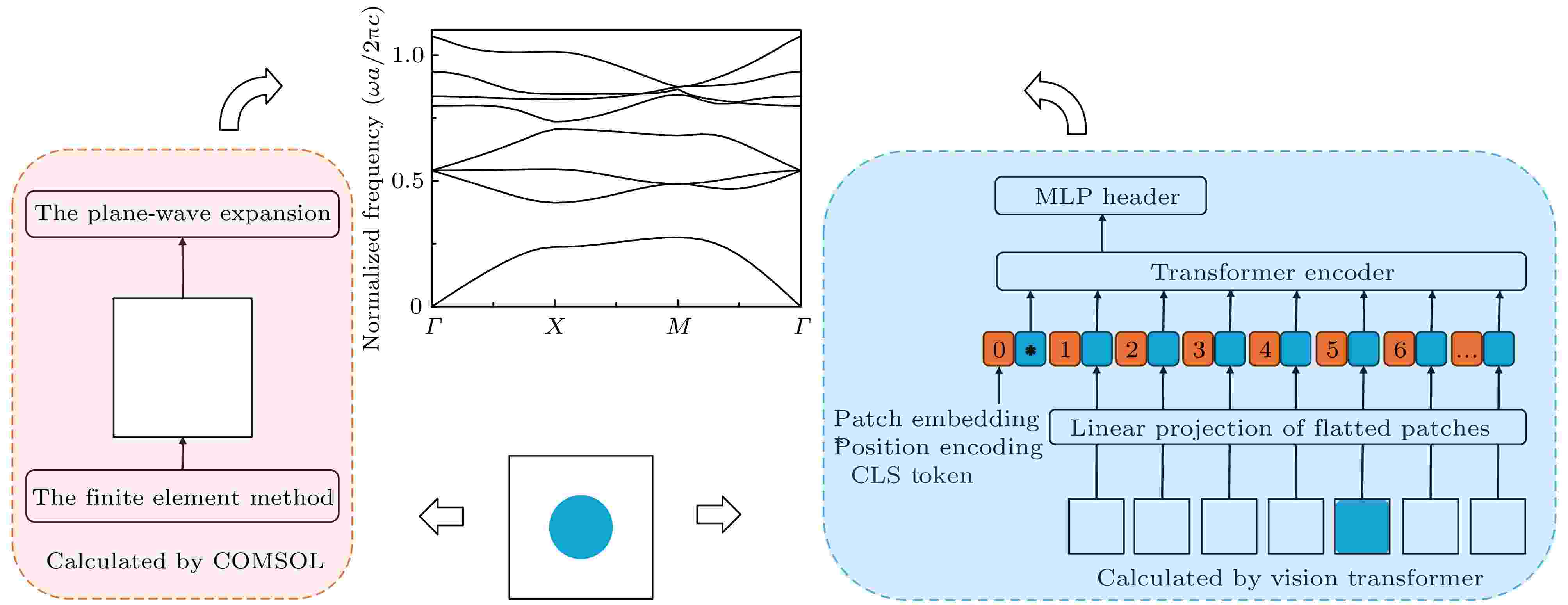 Photonic crystals have received widespread attention in the field of photonics due to their unique band structures, which can manipulate the propagation of light through periodic dielectric arrangements. Accurate prediction of these band structures is crucial for designing and optimizing photonic devices. However, traditional numerical simulation methods, such as plane wave expansion and finite element methods, are often limited by high computational complexity and long processing times. In this study, we explore the application of the vision transformer (ViT) model to predicting the band structures of photonic crystals efficiently and accurately. To further validate the superiority of the ViT model, we also conduct experiments by using CNN and MLP models on the same scale for band structure prediction. We first generate a dataset of photonic band structures by using traditional numerical simulations and then train the ViT model on this dataset. The ViT model demonstrates excellent learning capabilities, with the loss function value decreasing to as low as 4.42×10–6 during training. The test results show that the average mean squared (MSE) error of the ViT model predictions is 3.46×10–5, and the coefficient of determination (R2) reaches 0.9996, indicating high prediction accuracy and good generalization capability. In contrast, the CNN and MLP models, despite being trained on the same dataset and having the same computational resource allocation, show higher MSE values and lower R2 scores. This highlights the superior performance of the ViT model in predicting the band structures of photonic crystals. Our study shows that the ViT model can effectively predict the band structures of photonic crystals, providing a new and efficient prediction tool for relevant research and applications. This work is expected to advance the development of photonic device design by offering a rapid and accurate alternative to traditional methods.