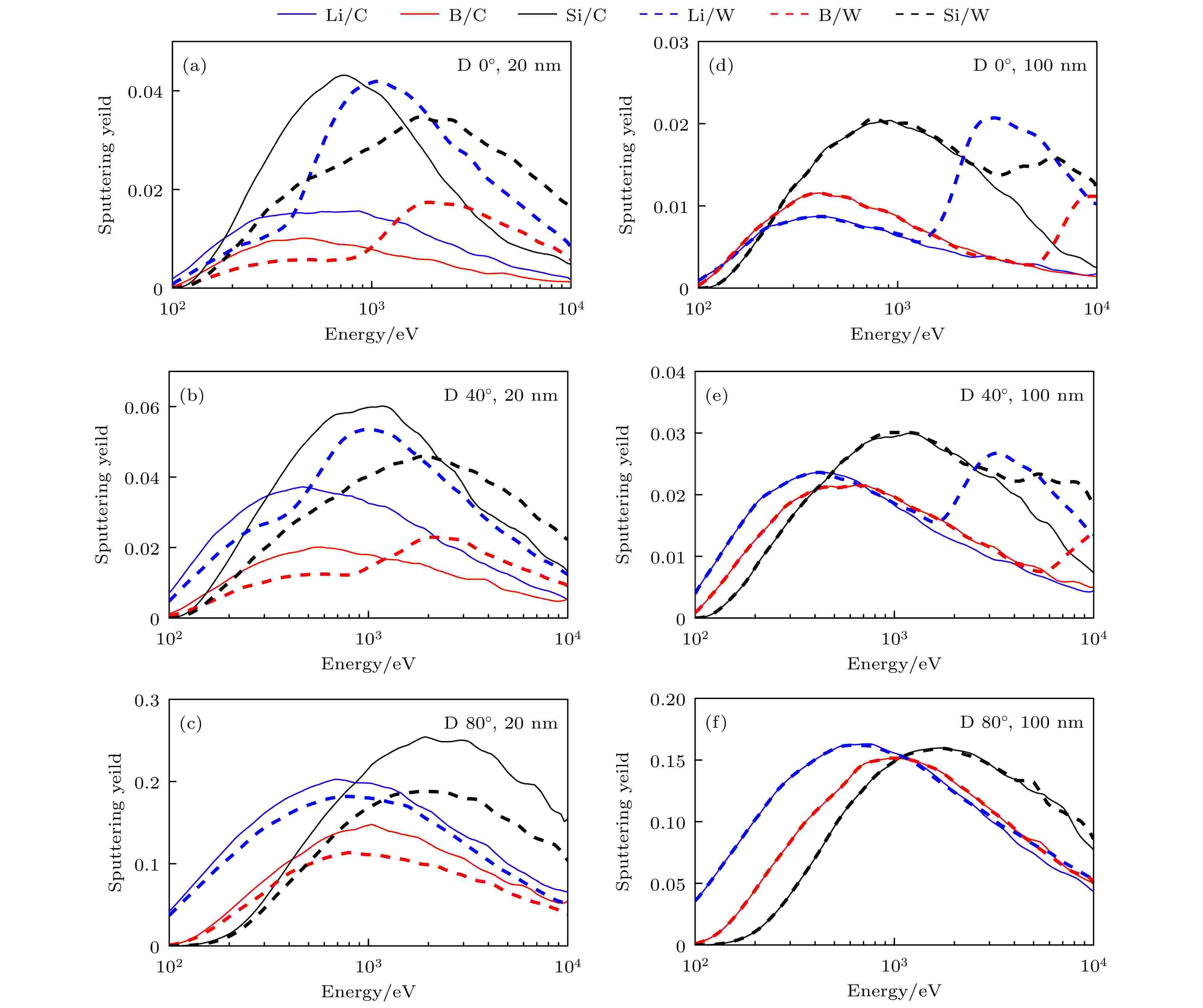 Wall conditioning coatings—lithium (Li), boron (B) and silicon (Si)—introduced by lithiumization, boronization, or siliconization, serve as a critical strategy for suppressing fuel recycling and reducing impurity fluxes from the wall of a tokamak. These techniques directly improve plasma initiation, reproducibility, energy confinement, and operational stability in fusion devices. However, these coatings undergo both physical and chemical sputtering by boundary plasma bombardment. This erosion behavior critically determines coating lifetime and, consequently, long-pulse plasma performance. To evaluate the influence of physical sputtering on coating durability and to compare material-specific differences, binary collision approximation (BCA) simulations are conducted to investigate the physical sputtering behaviors of Li, B, and Si coatings. Carbon (C) and tungsten (W) substrates are also modeled to assess interface effects. The results reveal the significant differences in sputtering yields between Li, B, and Si in incident angles and deuterium energies. Owing to its low surface binding energy, lithium exhibits the highest sputtering yield at large angles and low energies, while silicon, with the highest atomic number, presents the highest sputtering yield at small angles and high energies. Sputtering yields of carbon-based and tungsten-based coatings vary with angle and energy, driven by their differences of deuterium backscattering and substrate sputtering at the interface. Notably, for tungsten-based coatings, the sputtering yields increase dramatically at specific energies. This occurs because tungsten’s high surface binding energy causes incident deuterium atoms to reflect off the tungsten interface and then collide with coating elements. Consequently, when the energy transferred to the surface element is higher than its sputtering threshold, the sputtering yield increases. Additionally, increasing incident fluence modifies the target composition, leading to corresponding changes in the sputtering yields of coating materials. In summary, coating materials should be selected according to the expected angle distribution and energy distribution of the incident plasma particles. To suppress the abrupt yield increase observed in tungsten substrates at specific energies, the coatings must be sufficiently thick. These findings provide a theoretical basis for selecting conditioning materials and optimizing wall conditioning strategies in fusion devices.