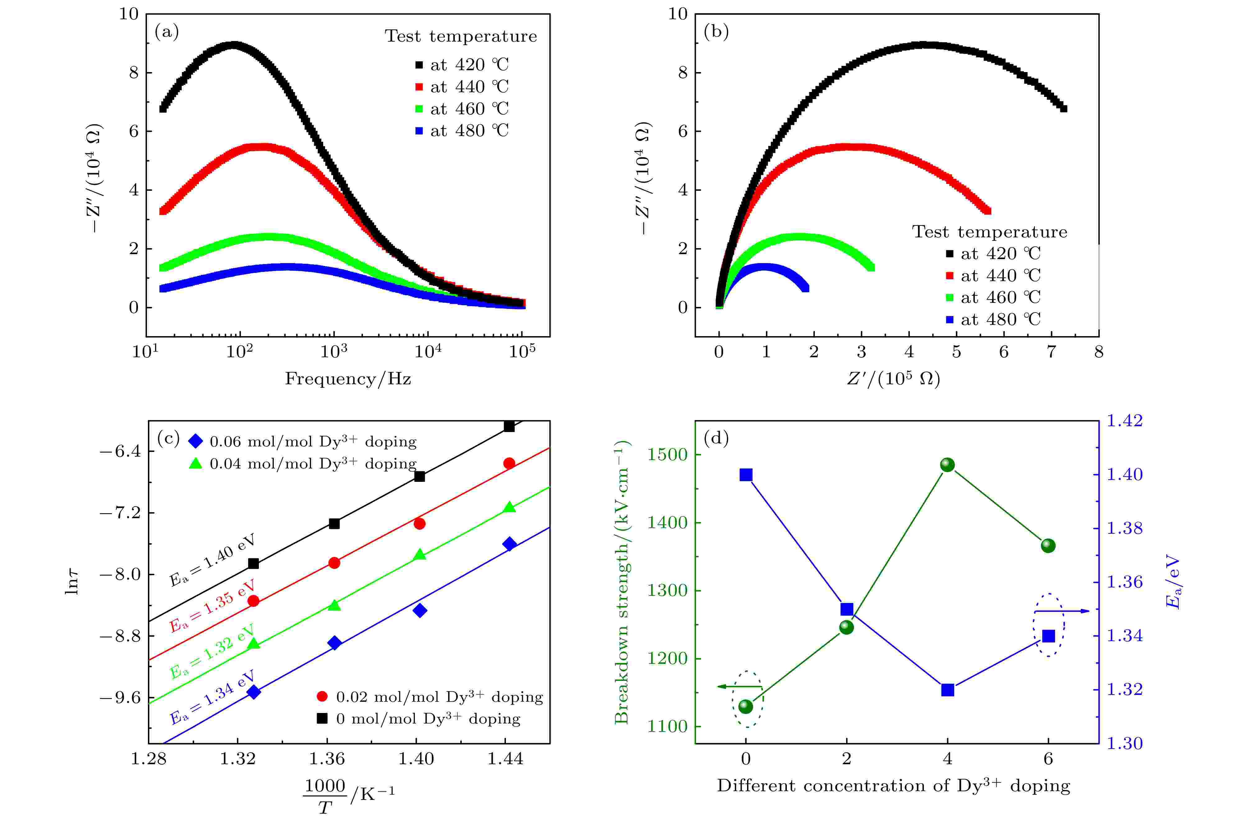 Dielectric glass ceramics that combine high power density and high energy density have important application value in achieving lightweight, miniaturization, and integration of pulse power devices. Compared with dielectric ceramics and polymers, dielectric glass-ceramics are composites consisting of a ceramic phase dispersed within a glass phase. Through the high-temperature melting, rapid cooling, and specific-temperature crystallization, the ceramic phase becomes uniformly distributed within the dense glass matrix, resulting in a composite structure characterized by low porosity, uniform grain size, and high density. Owing to the introduction of the high-dielectric-constant ceramic phase, the glass-ceramics exhibit excellent dielectric response. Furthermore, the pore-free, continuous, and highly insulating glass matrix effectively enhances the overall breakdown resistance of the material. Different molar concentrations of rare earth Dy3+ doped BaO-Na2O-Nb2O5 based glass ceramics are prepared using high-temperature melting combined with temperature-controlled crystallization process. The raw materials of glass ceramics are weighed according to the stoichiometric ratio and homogeneously mixed using a ball mill. The thoroughly mixed raw materials are placed in a high-temperature glass furnace and melted at 1550 ℃ for 2.5 h to ensure complete fusion. The melt is then rapidly cast into a preheated metal mold to obtain bulk glasses. These glasses are annealed at 650 ℃ for 3 h to relieve residual stresses. Subsequently, the transparent bulk glass blocks are cut into thin slices. Finally, these slices are heat-treated at 1100 ℃ for 3 h. Upon cooling, Dy3+ doped -based glass-ceramics with varying molar concentrations of the rare-earth ion are obtained. The effects of different molar concentrations of rare earth Dy3+ doping on the microstructure, crystallization behavior, and dielectric energy storage performance of BaO-Na2O-Nb2O5 based glass ceramics are systematically studied. The test results show that rare earth Dy3+ doping has almost no effect on the phase structure of BaO-Na2O-Nb2O5 based glass ceramics. Moderate rare earth Dy3+ doping can effectively promote the precipitation of Ba2NaNb5O15 ceramic phase in tungsten bronze structure, while improving the crystallinity of glass ceramics and increasing the dielectric constant of glass ceramics. In addition, rare earth Dy3+ doping also has the effect of inhibiting the growth of glass ceramic grains, which can improve the breakdown strength of BaO-Na2O-Nb2O5 based glass ceramics. When the rare earth Dy3+ doping molar concentration is 0.04 mol/mol, the dielectric constant of BaO-Na2O-Nb2O5 based glass ceramic is 97.0, the breakdown strength reaches 1485 kV/cm, and the highest energy storage density arrives at 8.01 J/cm3, which is 1.87 times that of undoped glass ceramics. This result provides experimental basis and technical reference for improving the performance of glass ceramic materials in the field of energy storage.