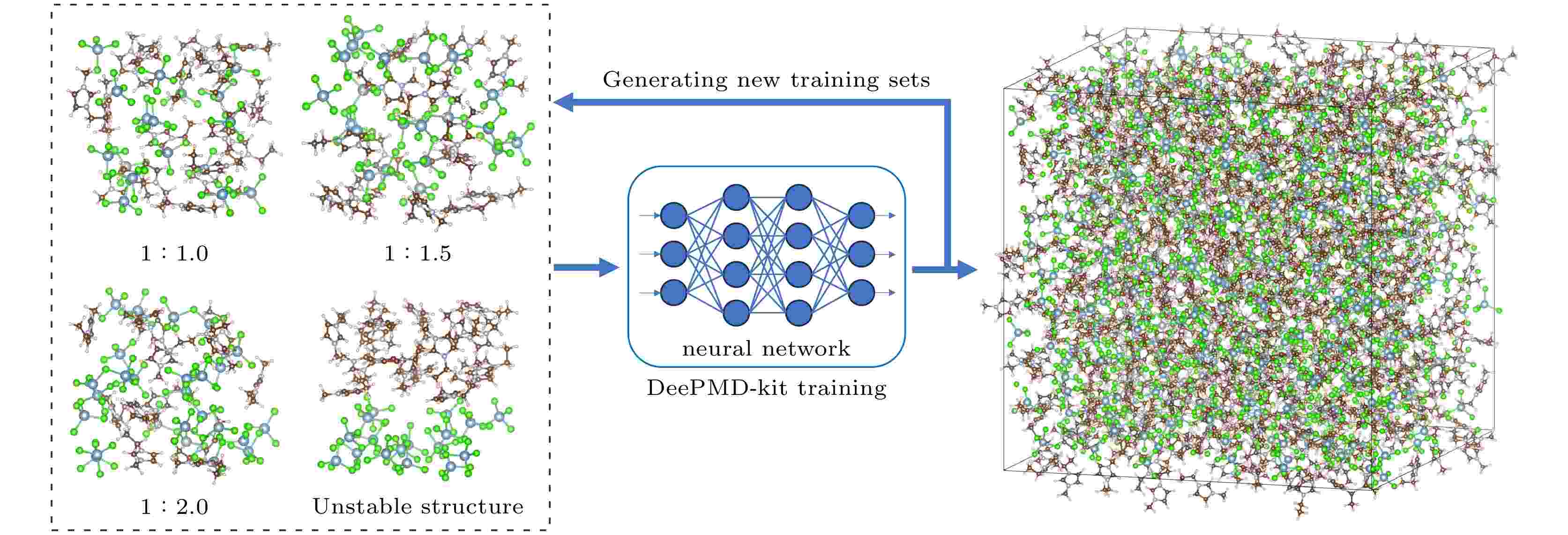 The [EMIm]+Cl–+AlCl3 ion liquid is a promising prototype electrolyte for aluminum-ion batteries (AIBs). Its ionic transport behavior involves multiple mobile species (Al3+, AlCl3, [AlCl4]– and [Al2Cl7]–), with ion migration mechanisms and conversion reactions among these species unsolved experimentally. This complexity results in heterogeneous ion migration mechanisms and sluggish diffusion kinetics, which cannot be accurately and reliably captured by the traditional first-principles molecular dynamics (FPMD) simulations within the very limited time duration (tens of ps) and relatively small modelling structure (less than 103 atoms). The classic molecular dynamics simulations based on various force fields are also scarce for studying and predicting the atomic structure evolution and ion diffusion dynamics of the complex electrolyte system such as ion liquids. In this work, a deep neural network interatomic potential (DP-potential) is developed through machine learning techniques, combining first-principles accuracy with classical molecular dynamics efficiency, to systematically investigate various chemical and physical properties for [EMIm]+Cl–+AlCl3 ion-liquid at finite temperatures. Training and validating of DP potential for [EMIm]+Cl–+AlCl3 ion liquid are implemented with a two-stage protocol, including the primary training stage and the refining stage. Before initiating the two training stages, a series of first-principles molecular dynamics (FPMD) simulations is performed for [EMIm]+Cl–+AlCl3 ion liquids with different molar ratios (1.0, 1.3, 1.5, 1.7 and 2.0) and equilibrium densities (1.09—1.56 g/cm3) at finite temperatures (300 K and 400 K), resulting in a highly diverse training datasets spanning a board range of chemical compositions and densities during the primary training stage for DP potential. Then, the trained DP-potential is employed to conduct long-timescale classic molecular dynamics simulations by using LAMMPS program for the [EMIm]+Cl–+AlCl3 ion liquids to produce the atomic configurations that either show significant errors in the calculated atomic forces and total energies or exhibit the unusual atomic evolution before crashing. Those highly extrapolated atomic configurations are merged with the initial training datasets to reoptimize the DP potential in the second refining stage. Through this two-stage training approach, a deep learning neural network interatomic potential with high accuracy is successfully constructed, achieving an energy prediction error of 5×10–4 eV/atom and a force prediction error of 5×10–2 eV/Å. The reliability of the finally obtained machine learning potential is further validated through a systematic comparison of radial distribution functions (RDF) for some representative atomic pairs such as C—N, C—H, Al—Cl and Cl—H, obtained from both DP-MD and FPMD, demonstrating excellent consistency for the results from the two methods. The DP-MD simulations are systematically carried out to investigate vibrational spectrum and Al3+ diffusion dynamics as well as possible conversion reactions among molecular or ionic species (Al3+, AlCl3, [AlCl4]– and [Al2Cl7]–) in [EMIm]+Cl–+AlCl3 ion liquids within 104 atoms at finite temperatures. From the calculated vibrational density of states (VDOS), it can be seen that the VDOS of [EMIm]+Cl–+AlCl3 ion liquid can be approximated as a simple superposition of the vibrational spectra of individual species ([EMIm]+, [AlCl4]–, and [Al2Cl7]–), with H related vibrational modes dominating above 90 THz and the Al—Cl modes dominating below 20 THz. At 300 K, DP-MD predicts that regardless of the chemical compositions, the diffusion coefficient of Al3+ remains around 4 × 10–7 cm2/s at 300 K and the estimated diffusion activation energy is about 0.20 eV, which is very close to the experimental measurement value (0.15 eV). In addition, the calculated ionic conductivity of [EMIm]+Cl– + AlCl3 at room temperature is 27.37 mS/cm, with a deviation of only 18.2% from the experimental value (23.15 mS/cm). Notably, two different Al3+ diffusion mechanisms are identified in [EMIm]+Cl–+AlCl3 ion liquid: 1) direct migration processes conducted solely by molecular species including [AlCl4]– and [Al2Cl7]–, and 2) the migration of the neutral AlCl3 molecule mediated with two neighboring [AlCl4]– anions through the conversion reaction between [Al2Cl7]– and AlCl3+[AlCl4]– moieties. Furthermore, first-principles calculations on the probable dissociation pathways of [Al2Cl7]– revealed from DP-MD predict a reaction energy barrier height of 0.49 eV for the AlCl3 transferring between two [AlCl4]– anions with an increased reaction probability from 0.00047 events/(ps·Al3+) at 1∶1.3 molar ratio to 0.00347 events/(ps·Al3+) at 1∶1.75 molar ratio. Overall, a highly efficient and reliable workflow to train and validate the deep neural network interatomic potential for complex electrolyte system is successfully proposed, such as [EMIm]+Cl–+AlCl3 ion liquids, thus providing a more comprehensive investigation of Al3+ transport mechanisms in ionic liquid electrolytes for aluminum-ion batteries. In conclusion, this work can further advance the application of machine learning-based potentials in simulating electrolyte systems characterized by complex molecular architectures and sluggish diffusion dynamics.