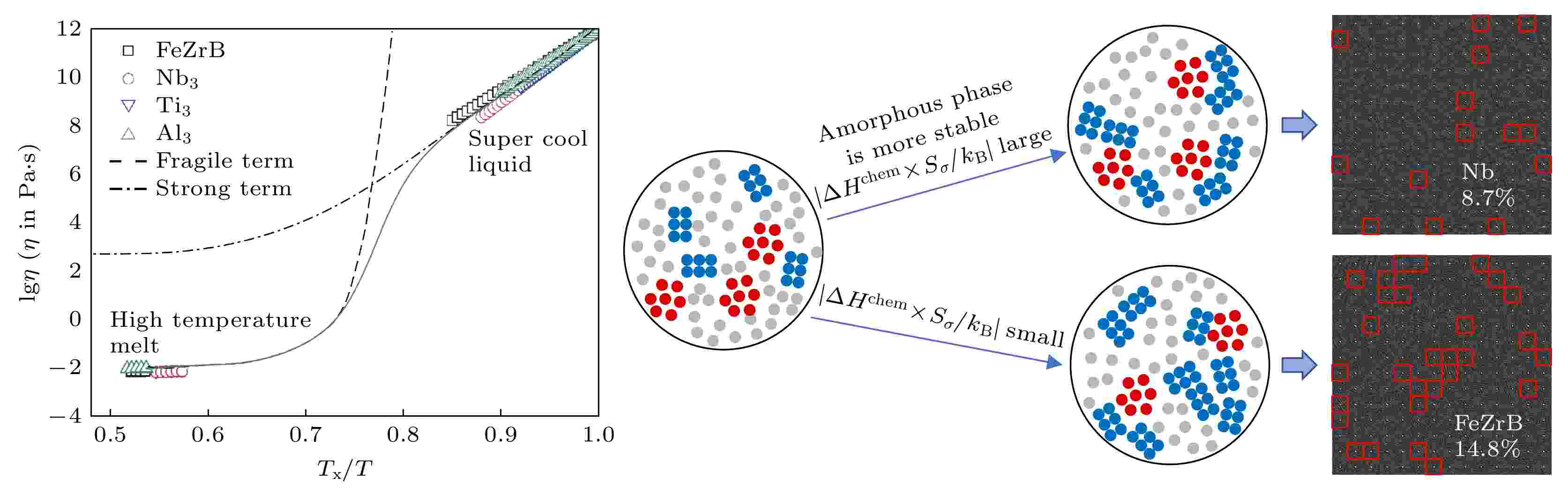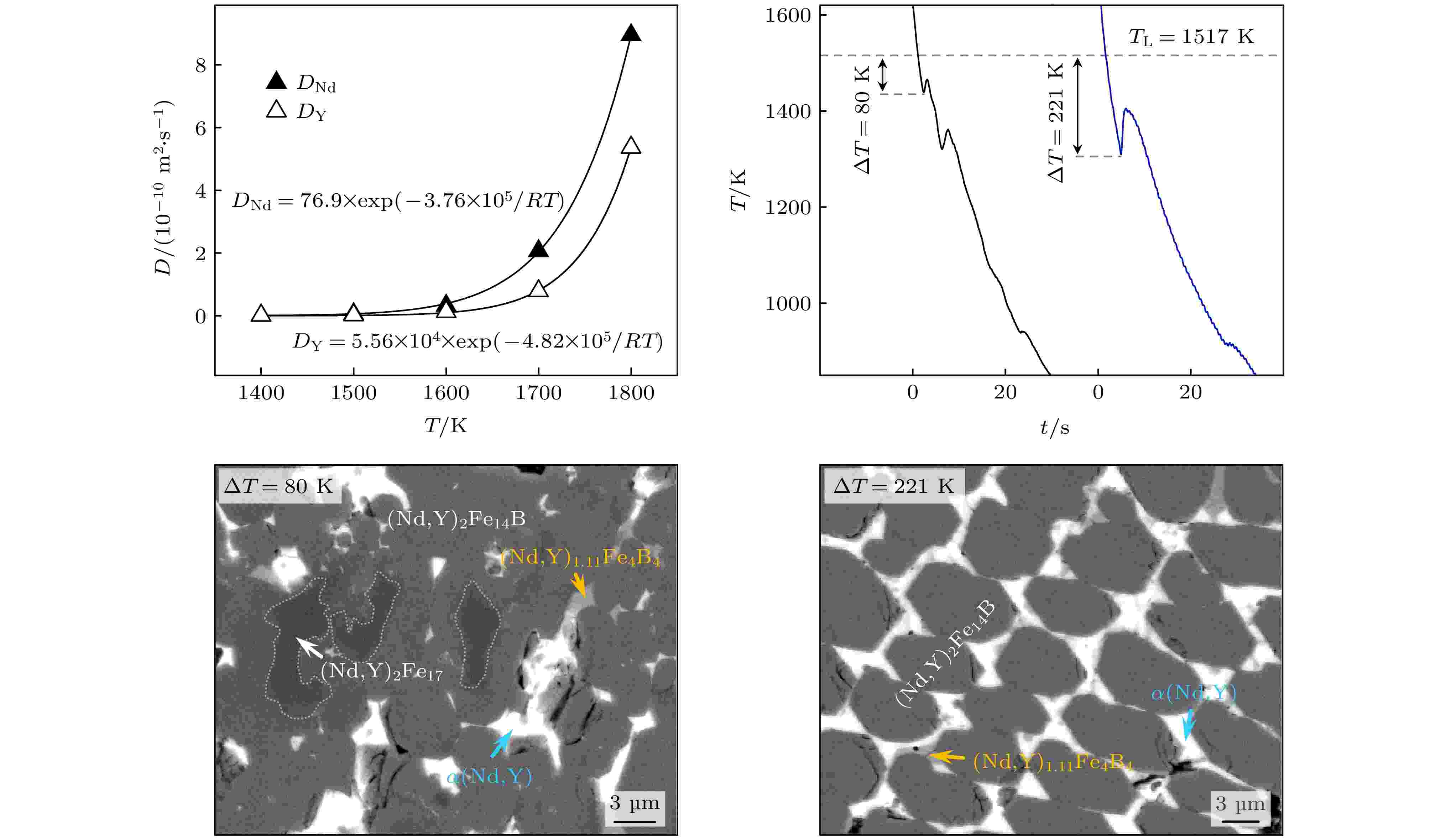 The metastable and stable liquid state thermophysical properties and rapid solidification mechanism of quaternary Fe75.6Nd10Y9B5.4 alloy with a maximum undercooling temperature of 221 K (0.14TL) are investigated using electrostatic levitation technique. The measured results indicate that the density, thermal expansion coefficient and the ratio of specific heat to emissivity of the liquid alloy comply with linear functional relationship with temperature in the range of 1402–1618 K. Molecular dynamics (MD) simulations show that the diffusion coefficients of Nd and Y elements decrease exponentially with temperature decreasing, with the former exhibiting a larger diffusion coefficient at the same temperature. When the liquid undercooling rises from 80 to 158 K, the growth velocity of primary (Nd,Y)2Fe17 phase dendrites increases from 3.8 to 5.7 mm·s–1, while exhibiting significant grain refinement effect. Meanwhile, the increased undercooling also promotes peritectic transformation, leading the volume fraction of peritectic τ1-(Nd,Y)2Fe14B phase to reach up to 75%. Once the undercooling reaches 180 K, the former peritectic τ1 phase, rather than the primary (Nd,Y)2Fe17 phase, becomes the leading phase, which nucleates and grows directly from the undercooled liquid alloy, and its growth velocity increases with undercooling from 2.6 to 11.0 mm·s–1. The calculation results of formation enthalpy show that the solid solution of the Y element can enhance the thermodynamic stability of the (Nd,Y)2Fe17 phase and the τ1 phase, thereby explaining the reason why the content of Y element in both phases is significantly higher than that of Nd element. Nevertheless, the content of Nd element in the τ1 phase slightly increases because its diffusion ability is stronger than that of Y if undercooling is higher than 180 K.