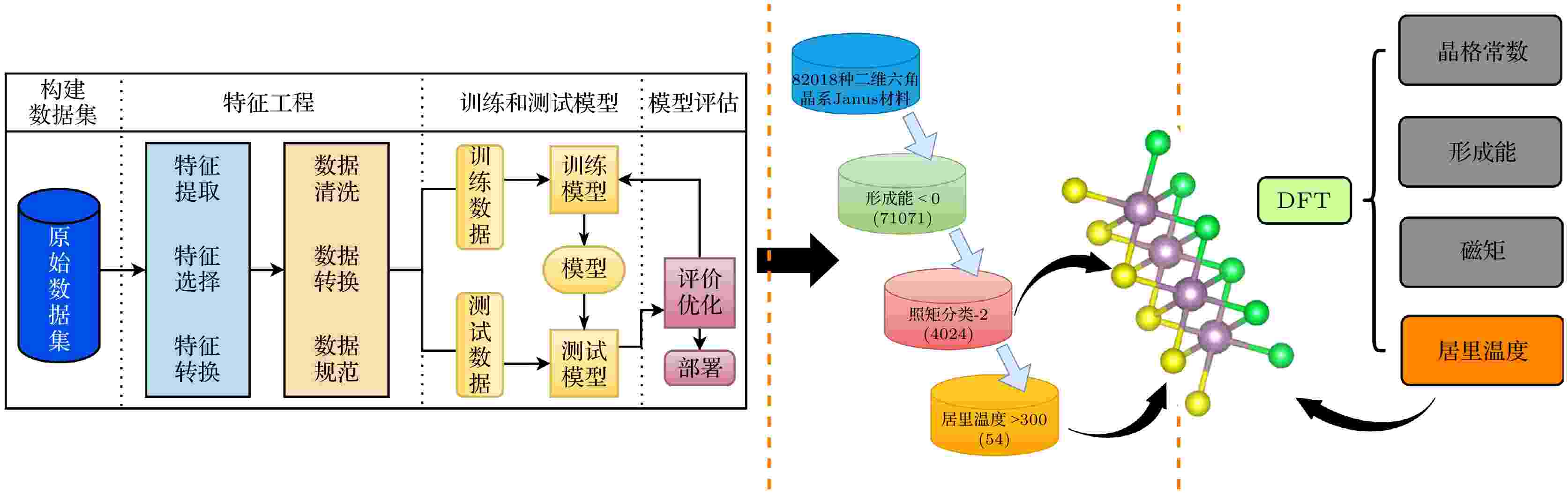 Magnetic skyrmions, characterized by their topological properties, serve as core components for developing next-generation non-volatile memory devices that demand high density, high speed, and low power consumption. Two-dimensional Janus magnetic materials inherently break spatial inversion symmetry, and easily generate strong DMI, providing an ideal platform for skyrmion generation and novel racetrack memory applications. Identifying high Curie temperature (Tc) materials is essential for ensuring magnetic stability and high-temperature application viability. This study integrates literature and open-source databases to construct a dataset of 16880 ABC-type two-dimensional materials. By utilizing stoichiometric ratios, intrinsic elemental properties, and electronic structure features as descriptors, four machine learning models, i.e. random forest (RF), gradient boosting decision tree (GBDT), extreme gradient boosting (XGBoost), and extra trees (ET) are employed for Tc prediction. Model performance is evaluated via ten-fold cross-validation, revealing that the XGBoost model exhibits superior prediction accuracy and generalization capability. Leveraging this model, Tc is predicted for 4024 unexplored two-dimensional Janus materials. This screening identifies 54 promising candidates possessing thermal stability, high magnetic moment, and a Tc exceeding 300 K. To verify reliability, four candidate systems (EuFeO, GdKTi, DyFeTb, ErFeGd) are randomly chosen for theoretical validation by using first-principles calculations combined with the Heisenberg model. For systems exhibiting strong correlation effects (containing d-orbital electrons), the Hubbard U parameter is included to describe on-site Coulomb repulsion. Exchange coupling constants are derived using the VASP software package. Subsequently, Tc values are calculated via classical Monte Carlo simulations performed using the MCSOLVER program. The research results show that the mean absolute error (MAE) of the predicted Tc is in good agreement with the model calculations for EuFeO and GdKTi, while larger deviations are observed for DyFeTb and ErFeGd. Nevertheless, the calculated Tc values for all four candidates exceed room temperature. This work establishes a new computational framework for the efficient screening of high-performance two-dimensional Janus magnetic materials, contributing to the advancement of magnetic storage technologies.