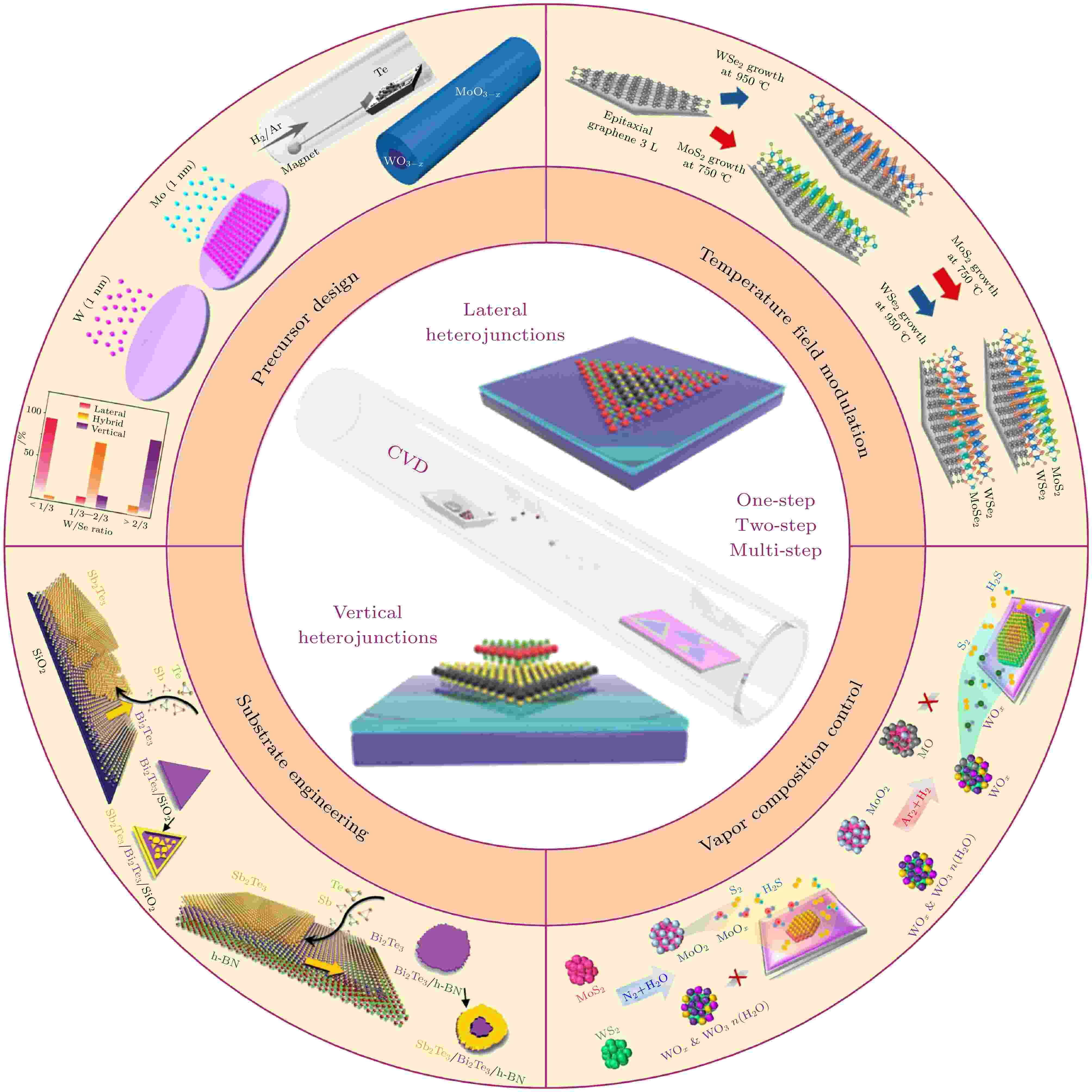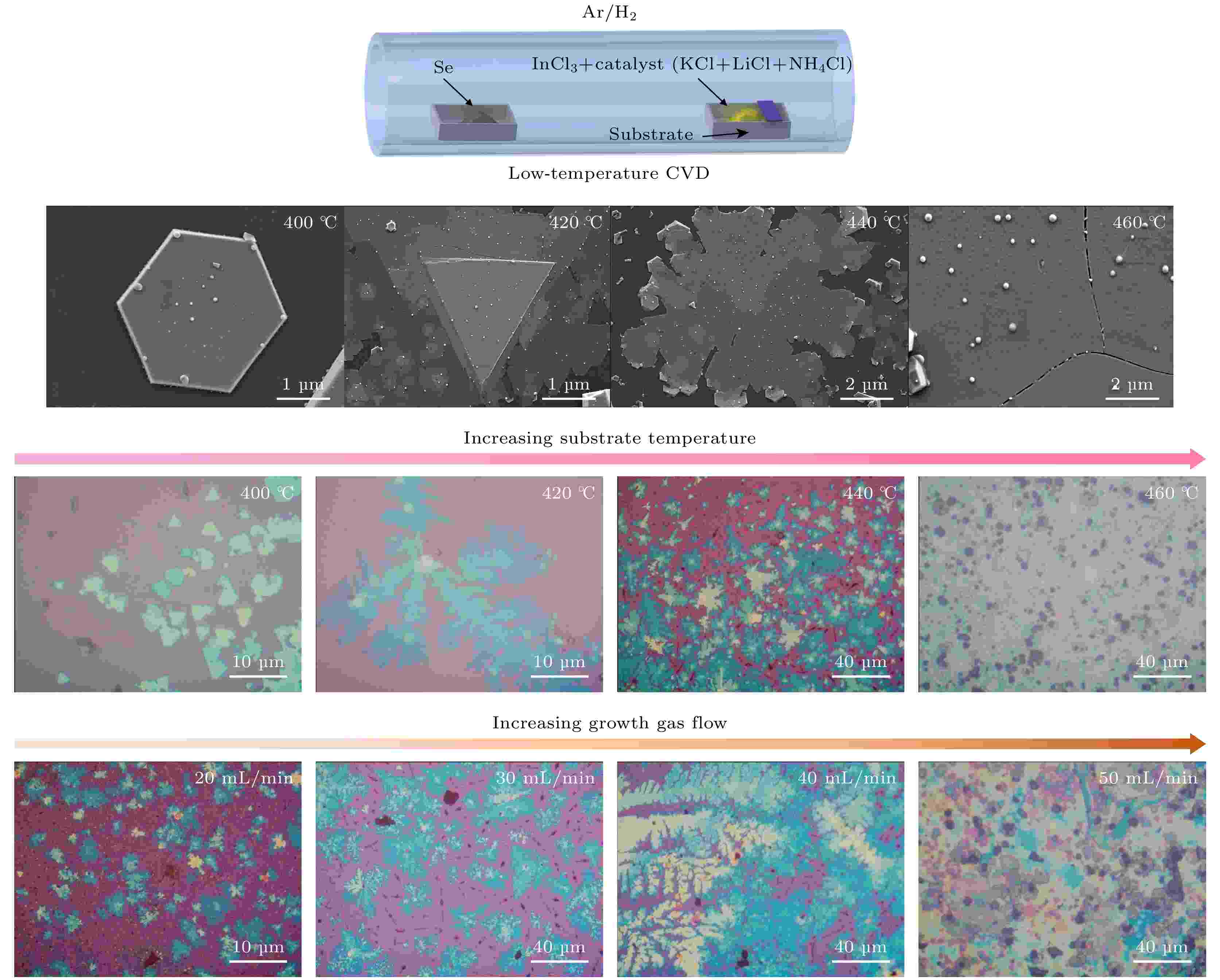 Two-dimensional ferroelectric α-In2Se3 possesses many fascinating physical properties. However, chemical-vapor-deposited ferroelectric α-In2Se3 typically requires high temperatures (>650 ℃). In this work, α-In2Se3 is synthesized at 400 to 460 ℃ by introducing a KCl/LiCl/NH4Cl ternary catalyst, resulting in a 200 ℃ reduction in growth temperature compared with ferroelectric α-In2Se3 synthesized by the traditional chemical vapor deposition (CVD) method. The surface morphology of the as-prepared material is controlled by temperature and gas flow rate. As the growth temperature increases from 400 to 460 ℃, the synthesized α-In2Se3 is changed from discrete hexagonal flakes to a continuous and uniform thin film, which is confirmed by the scanning electron microscope. Raman spectroscopy shows that the characteristic peaks of In2Se3 are located at 103, 180, and 195 cm–1, respectively, indicating that the CVD-grown In2Se3 is α-phase. Furthermore, energy dispersive spectrometer and X-ray photoelectron spectroscopy indicate that the elemental composition is close to the ideal stoichiometric ratio, confirming the successful synthesis of the α-In2Se3. Then, the as-prepared α-In2Se3 is transferred onto Si/SiO2 substrate for device fabrication. Atomic force microscope indicates that the film is uniform, with an approximate thickness of 63 nm. The fabricated two-terminal memristors exhibit analogous resistive switching behaviors. And such memristors are used to achieve synaptic functions of long-term potentiation/long-term depression. For artificial neural network simulations based on the synaptic memristors, the recognition accuracy for hand-written digit image exceeds 90%. This work provides a practical method for growing two-dimensional ferroelectric α-In2Se3 at low temperatures for applications in synaptic devices and neuromorphic computing.