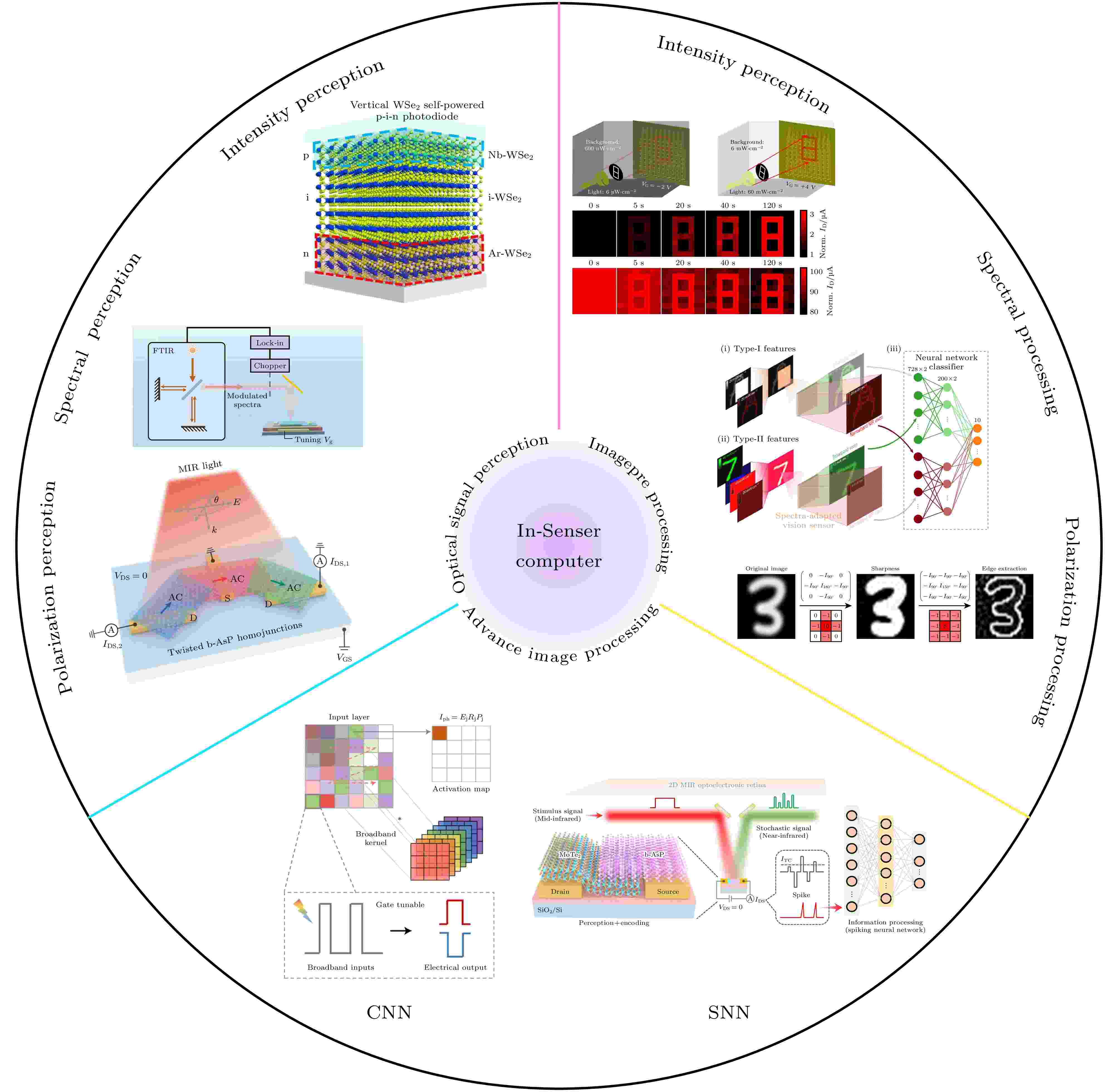 This paper provides a comprehensive review of recent advances in high-performance photodetectors based on two-dimensional materials and in-sensor computing for intelligent image processing, aiming to address the challenges of the “memory wall” and “power wall” caused by the separation of sensing, storage, and computing in traditional image sensors. Traditional image processing relies on the von Neumann architecture, where a large volume of raw data generated at the sensing end must be transmitted to independent computing units or cloud platforms for processing, leading to high energy consumption, significant latency, bandwidth burden, and security risks. Owing to their atomic thickness, high carrier mobility, weak short-channel effects, and tunable optoelectronic properties, two-dimensional (2D) materials provide an ideal physical foundation for achieving function integration of perception and computation. This paper discusses the topic from three perspectives: optical signal perception, image preprocessing, and advanced image processing. In terms of optical signal perception, 2D materials and their heterostructures exhibit ultrahigh responsivity, broadband operation, and fast response in light-intensity detection, enable miniaturized spectrometers through bandgap modulation and computational spectroscopy, and achieve compact, full-polarization analysis via twisted layers and metasurface structures. In image preprocessing, 2D material devices can perform convolution and feature extraction at the sensing end through linear photoresponse, suppress noise and extend dynamic range via superlinear and sublinear responses, and mimic biological visual adaptation in spectral and polarization domains to enhance image quality and robustness. In advanced image processing, the tunable photoresponse and memristive characteristics of 2D materials enable sensor-level integration of sensing, storage, and computation, This allows for the realization of matrix-vector multiplication and convolution operations within convolutional neural networks, significantly reducing power consumption and improving efficiency. Meanwhile, by implementing spike-rate and temporal encoding of optical signals in spiking neural networks, 2D material devices can achieve event-driven image recognition and classification under low-power and low-latency conditions. Furthermore, this paper highlights the challenges faced by 2D material image sensors, including scalable fabrication, heterogeneous integration with silicon technology, array- and circuit-level optimization, environmental stability and encapsulation, and system-level implementation, while envisioning their broad application prospects in intelligent imaging, wearable electronics, autonomous driving, and biomedical diagnostics. It is concluded that with the joint progress in materials science, device engineering, and artificial intelligence, 2D materials are expected to drive the development of next-generation low-power, high-performance, intelligent image processing platforms, and to become an essential foundation for future information perception and processing technologies.